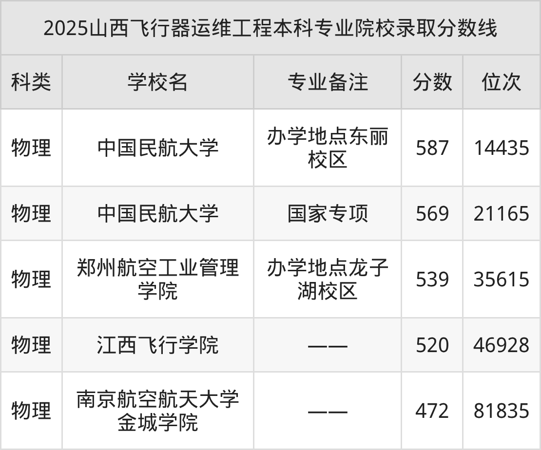 2025年山西飞行器运维工程分数线排名前5的大学名单(本科最难报考):