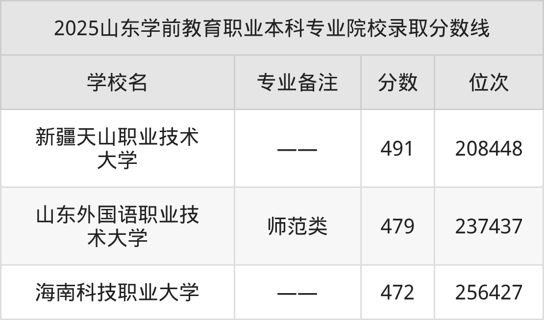 2025年山东学前教育职业本科专业招生院校有3所,分数最低的是海南科技职业大学(472分、位次256427名),分数最高的是新疆天山职业技术大学(491分、位次208448名)。