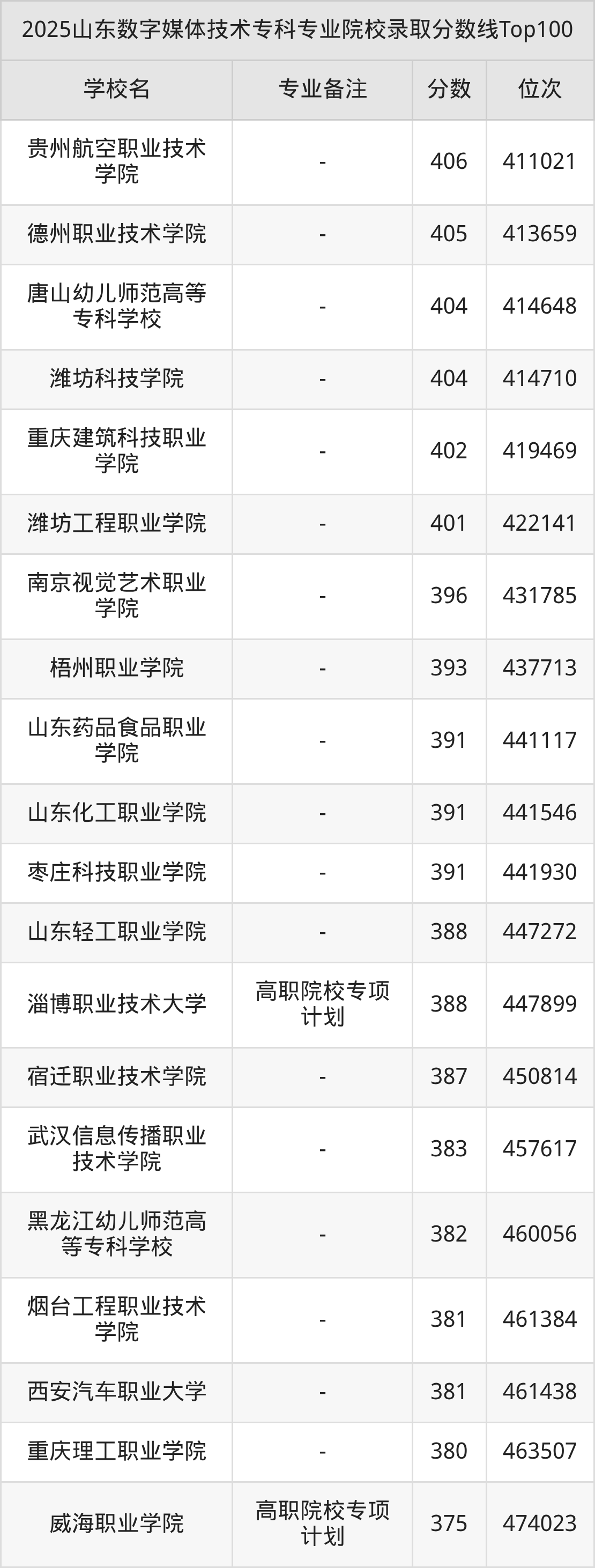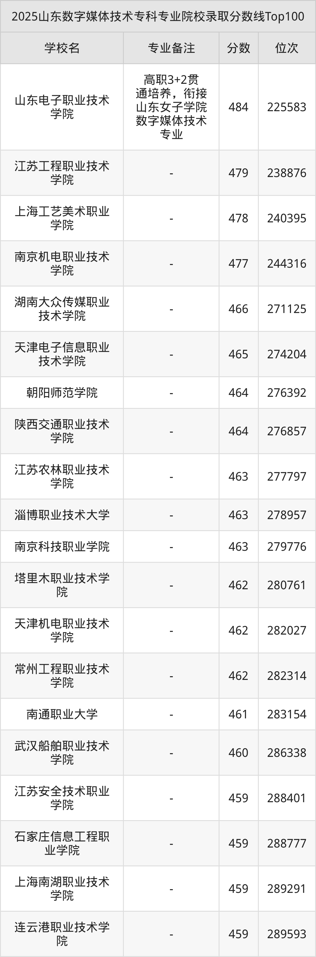 2025年山东数字媒体技术专科专业招生院校有144所,分数最低的是山东外事职业大学(150分、位次681099名),分数最高的是山东电子职业技术学院(484分、位次225583名)。