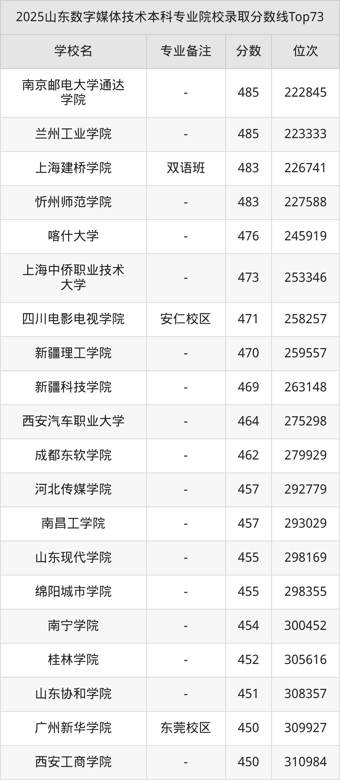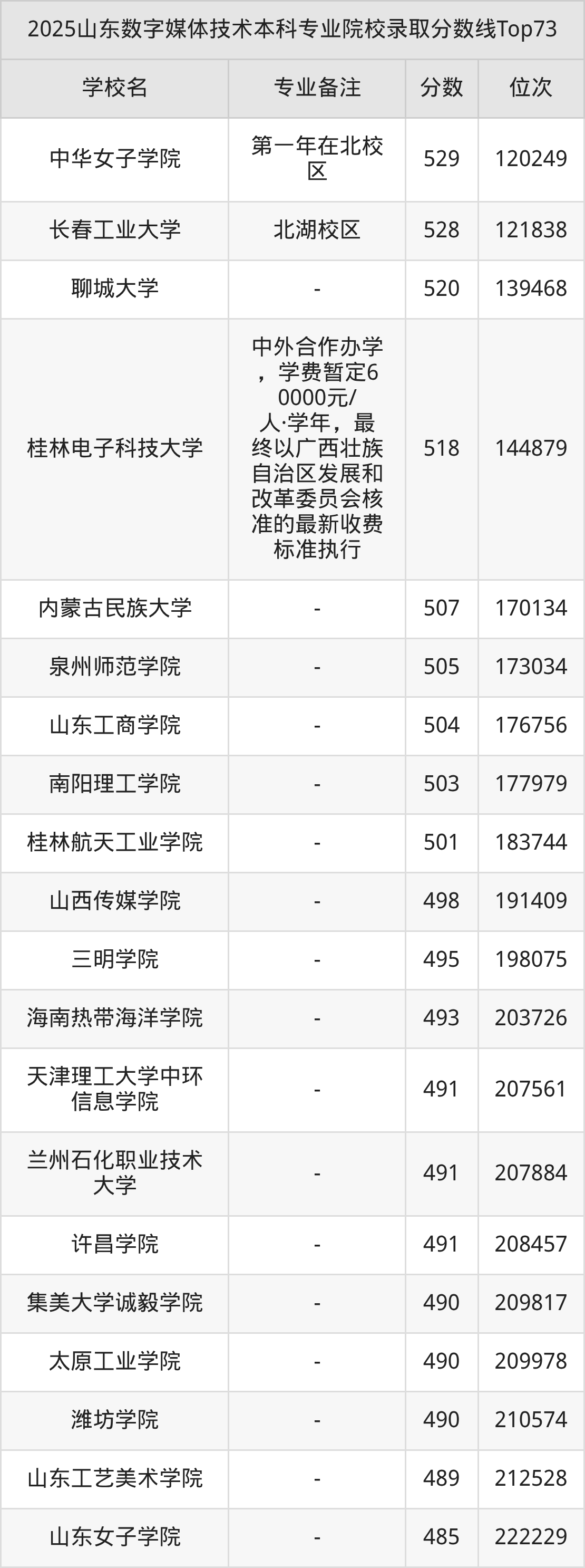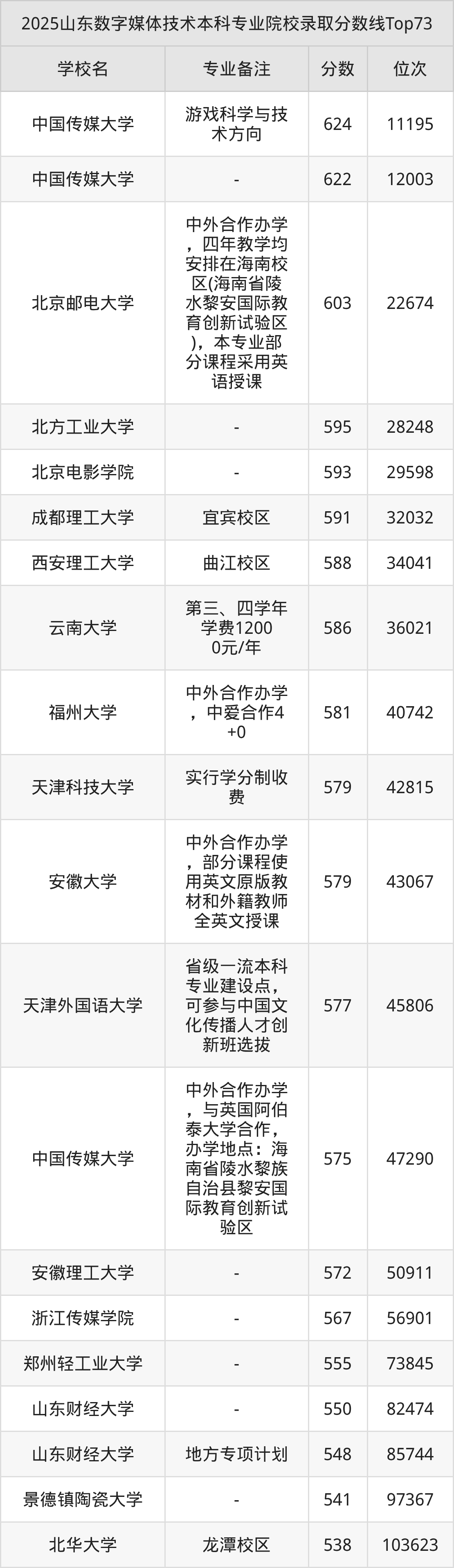 2025年山东数字媒体技术分数线排名前5的大学名单(本科最难报考):