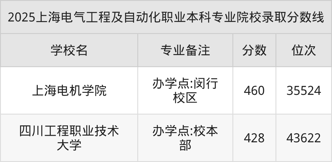2025电气工程及自动化专业在上海市录取分数线为:职业本科428分-460分。结合批次线来看,考生成绩超本科线26分及以上即有机会就读电气工程及自动化职业本科专业,低分录取的职业本科院校有四川工程职业技术大学。2026届考生可在下文查阅更多院校名单、分数及排名信息。