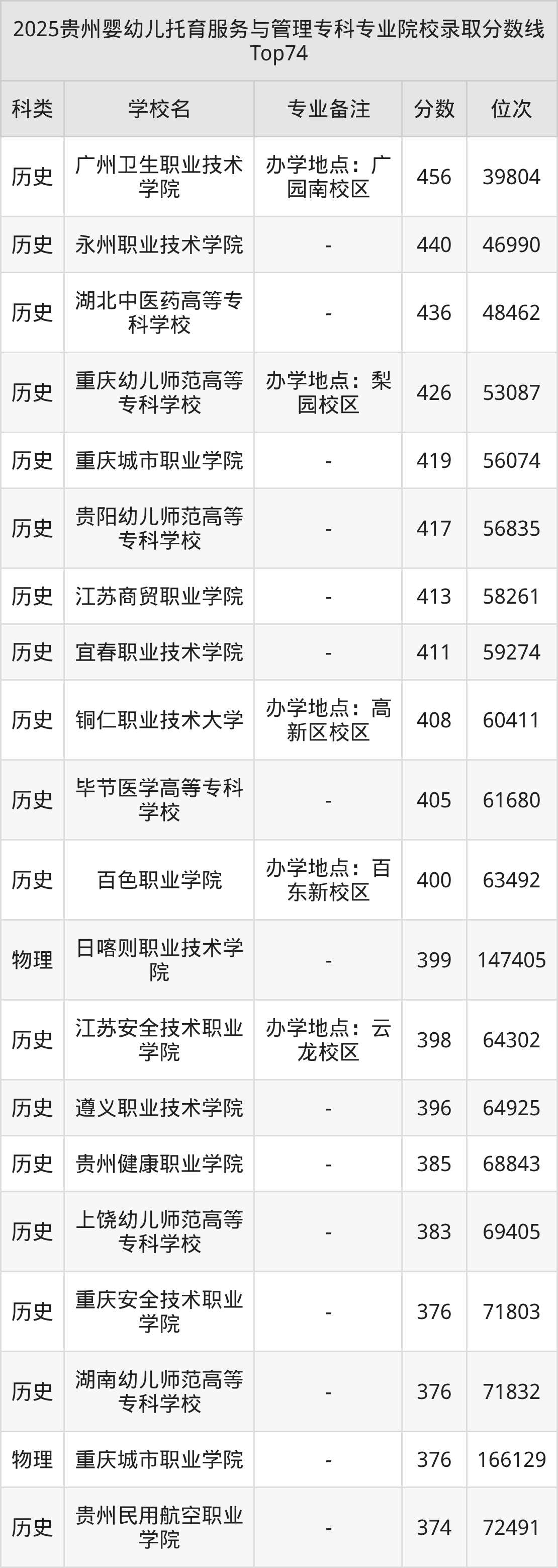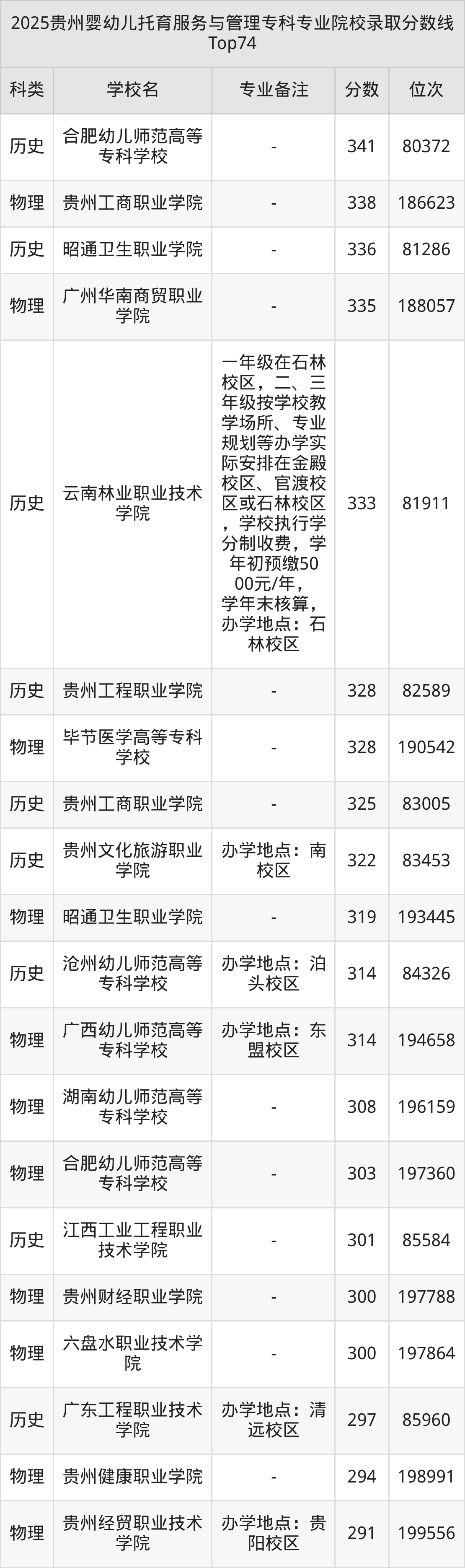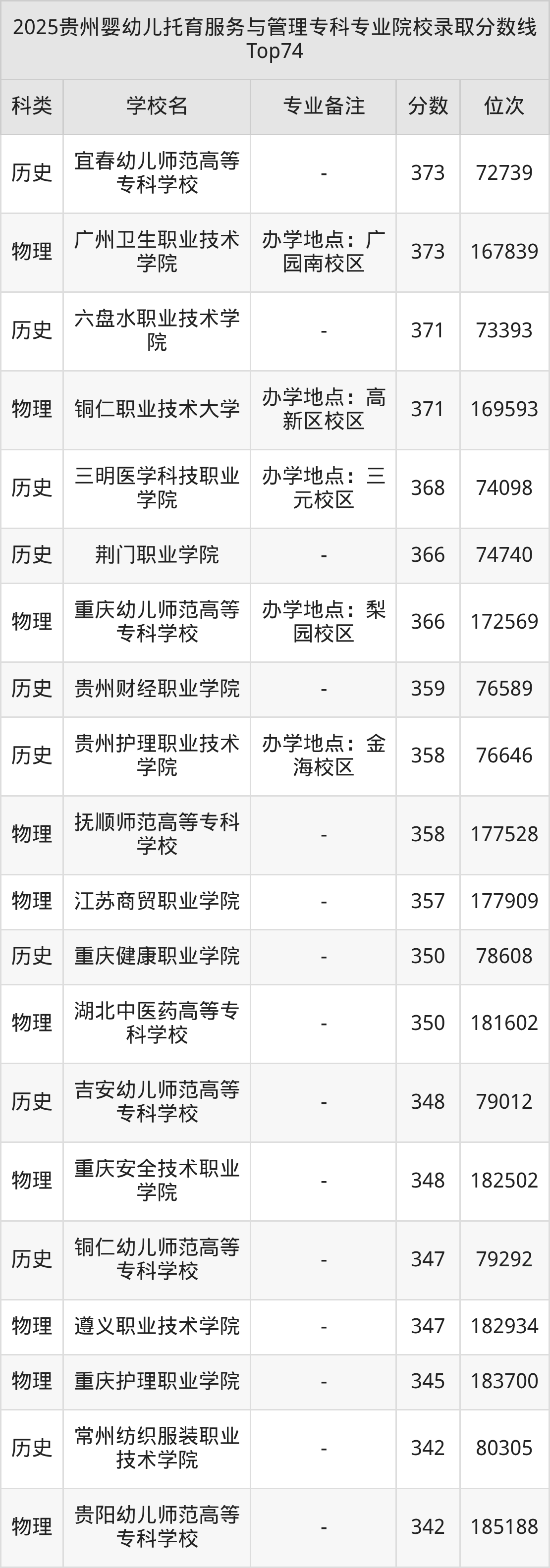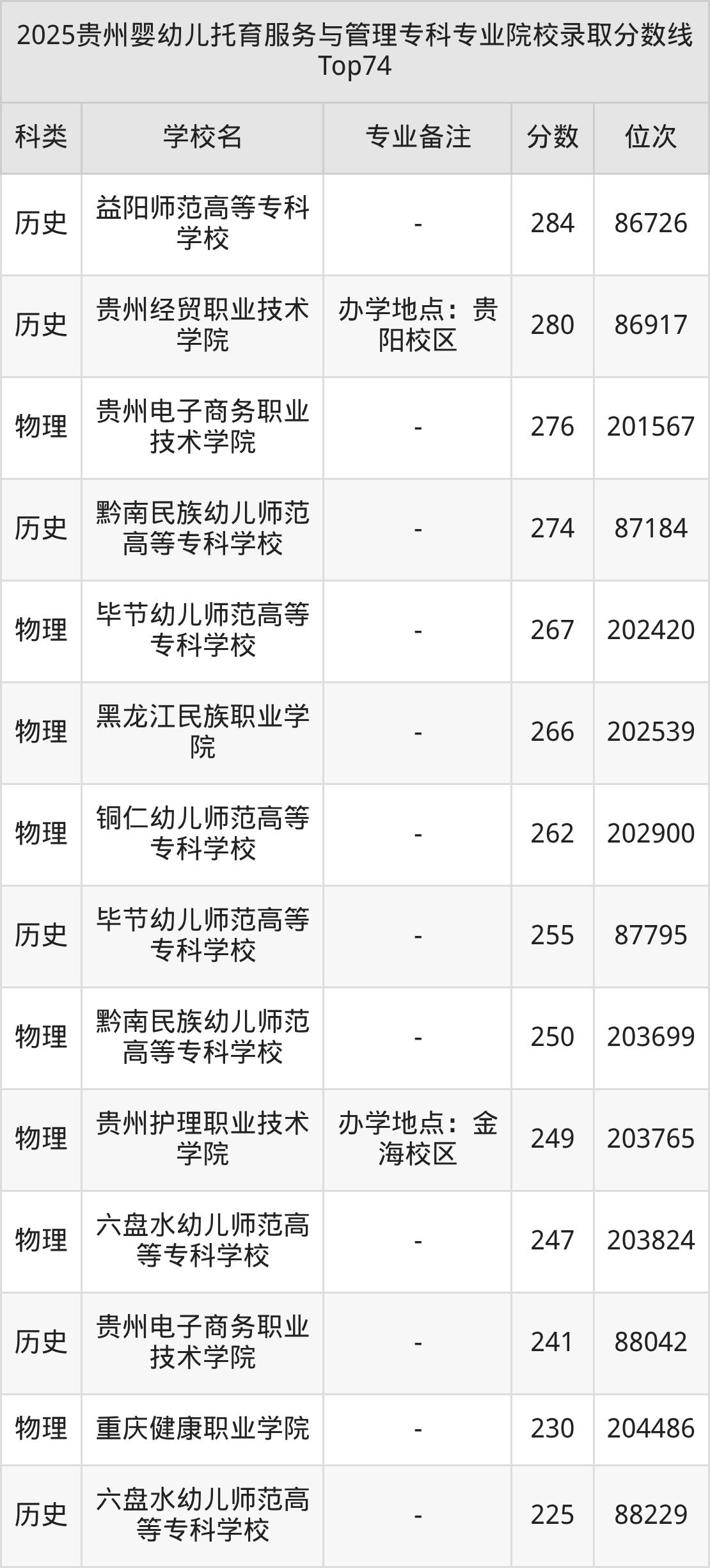 2025年贵州婴幼儿托育服务与管理分数线排名前5的大学名单(专科最难报考):
