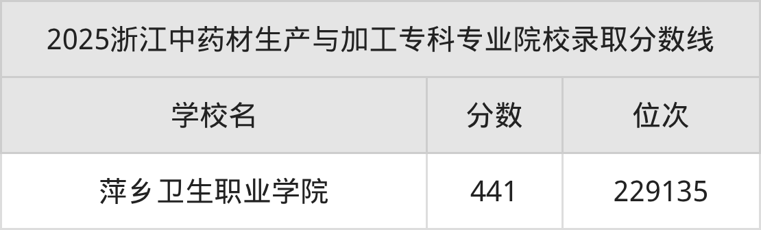 2025年浙江中药材生产与加工专科专业招生院校只有1所,即萍乡卫生职业学院,2025年该校中药材生产与加工专业在浙江省的最低录取分数线为441分,最低录取位次在229135名及以内。