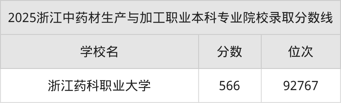 2025年浙江中药材生产与加工职业本科专业招生院校只有1所,即浙江药科职业大学,2025年该校中药材生产与加工专业在浙江省的最低录取分数线为566分,最低录取位次在92767名及以内。