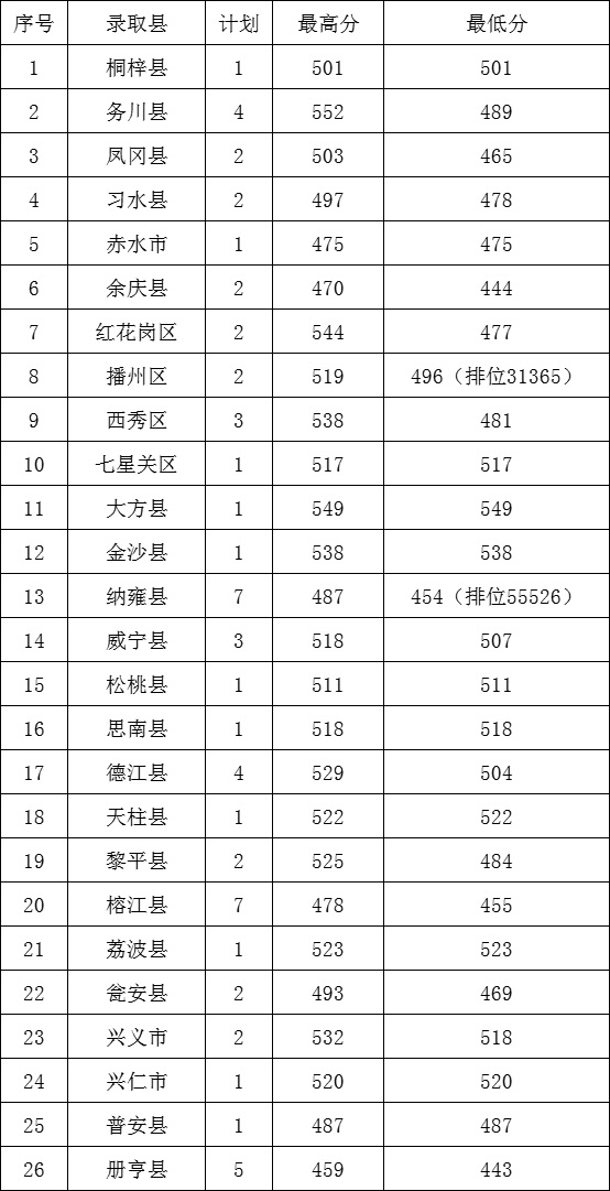 2023年贵州医科大学面向贵州省26个市(县)招生,各地的报考最低分如下: