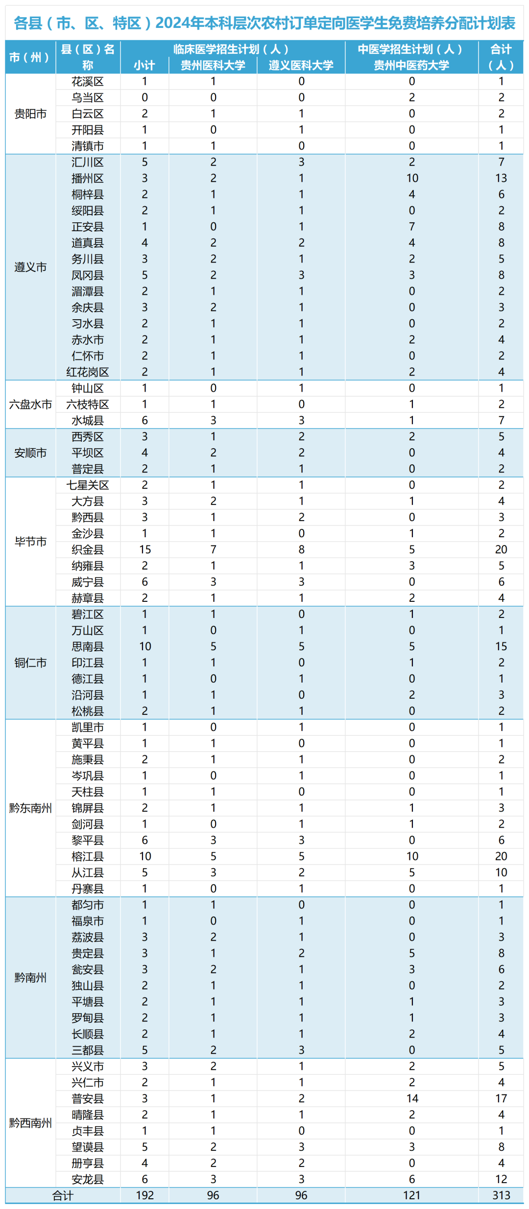 2024年贵州省本科定向医学生招生计划为313名,其中临床医学192名、中医学121名。
