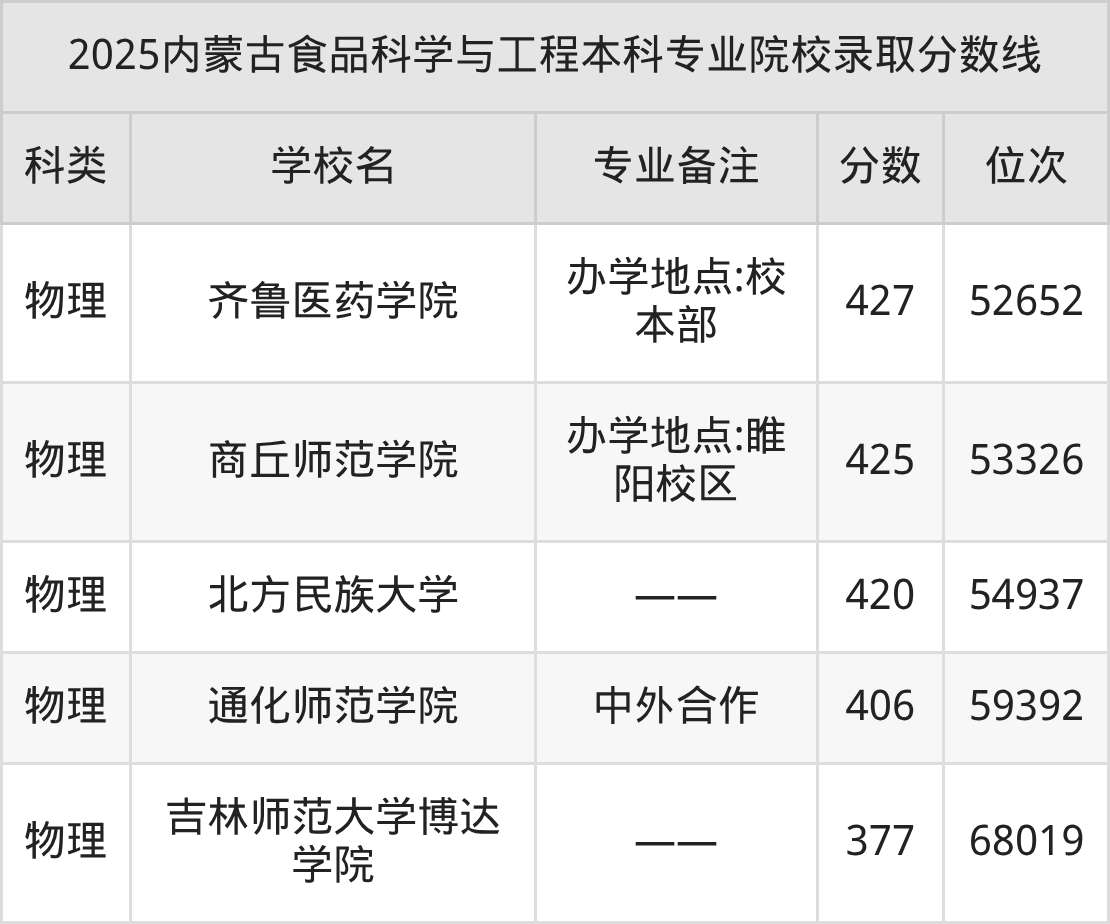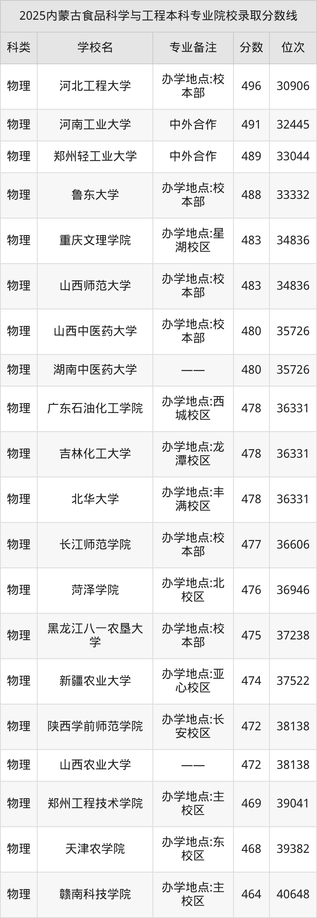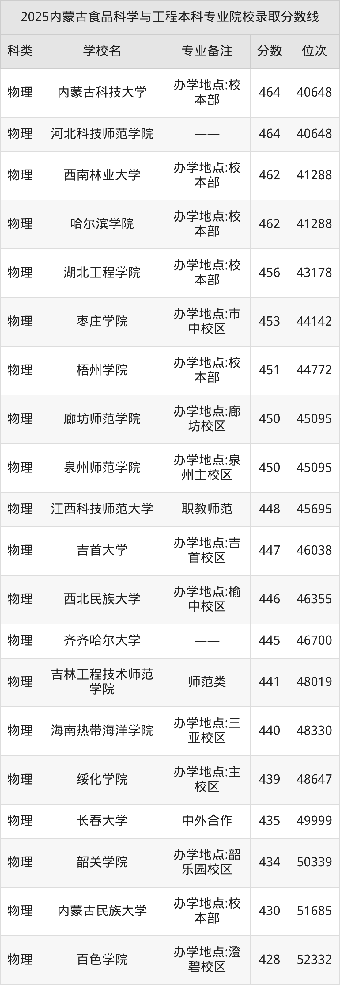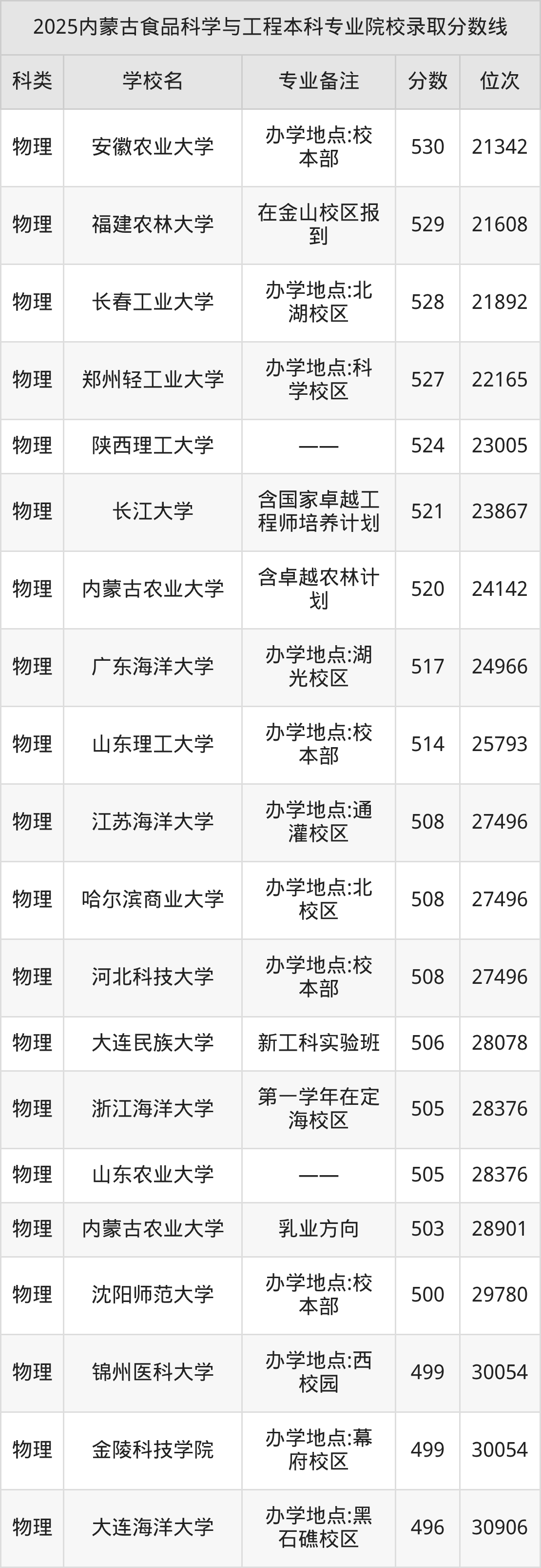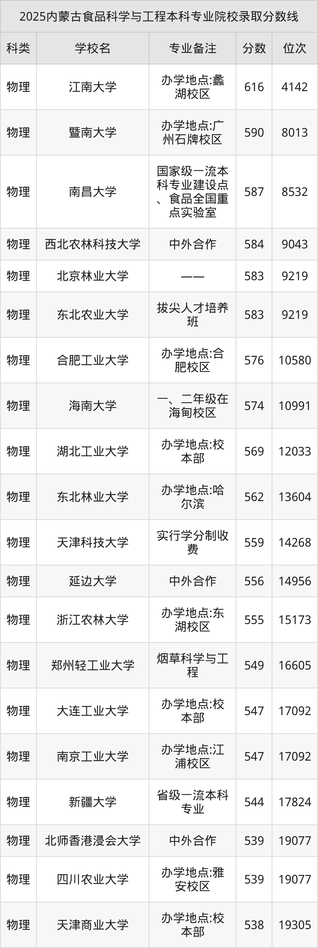 2025年内蒙古食品科学与工程分数线排名前5的大学名单(本科最难报考):