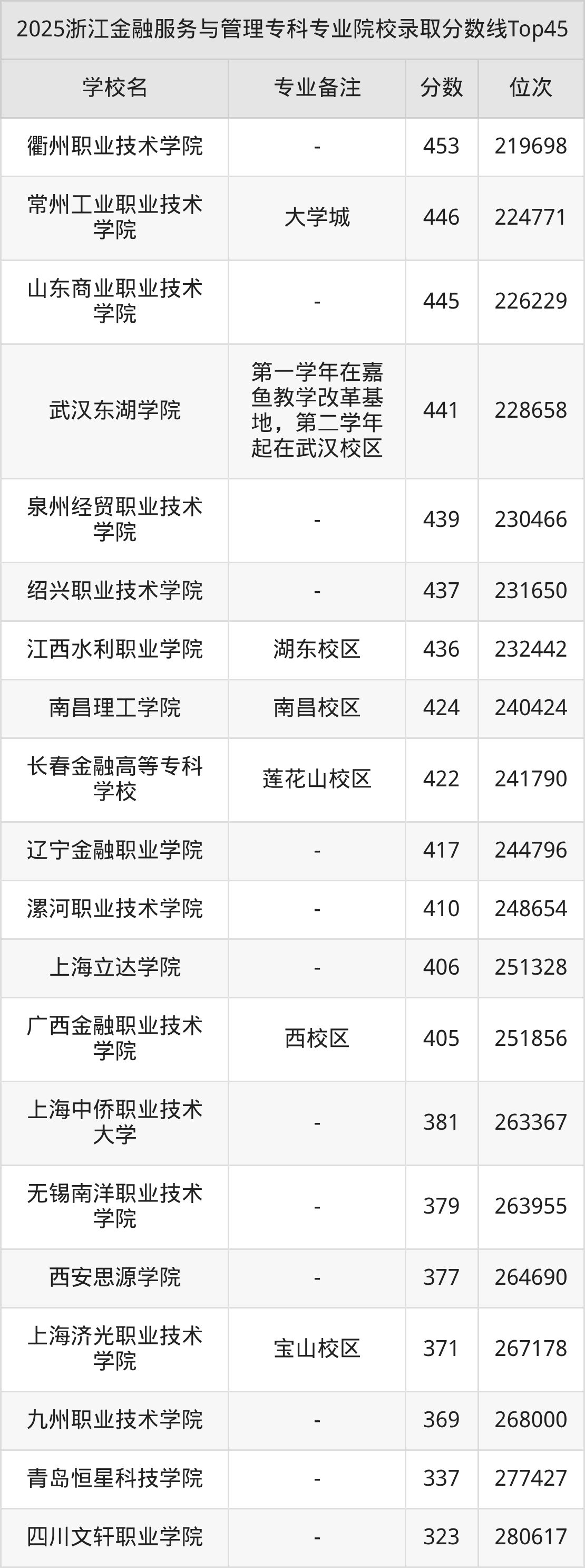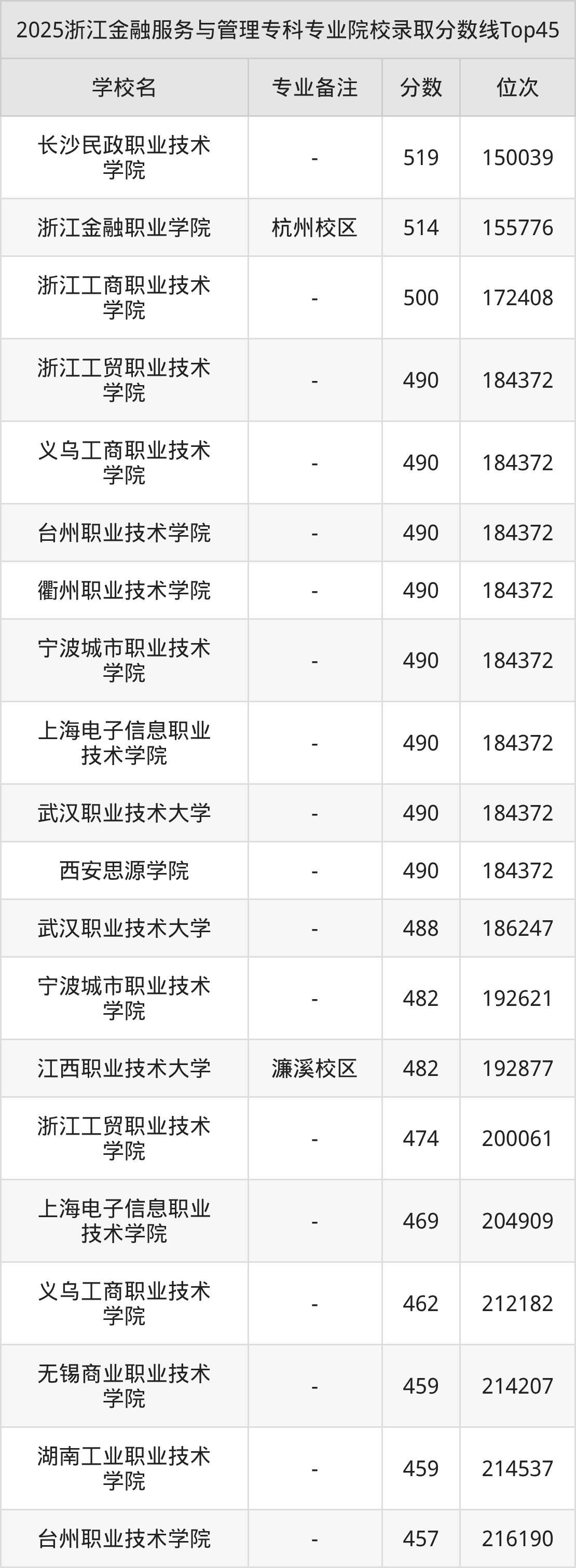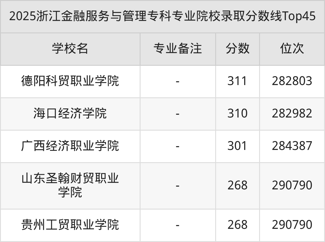 2025年浙江金融服务与管理分数线排名前5的大学名单(专科最难报考):