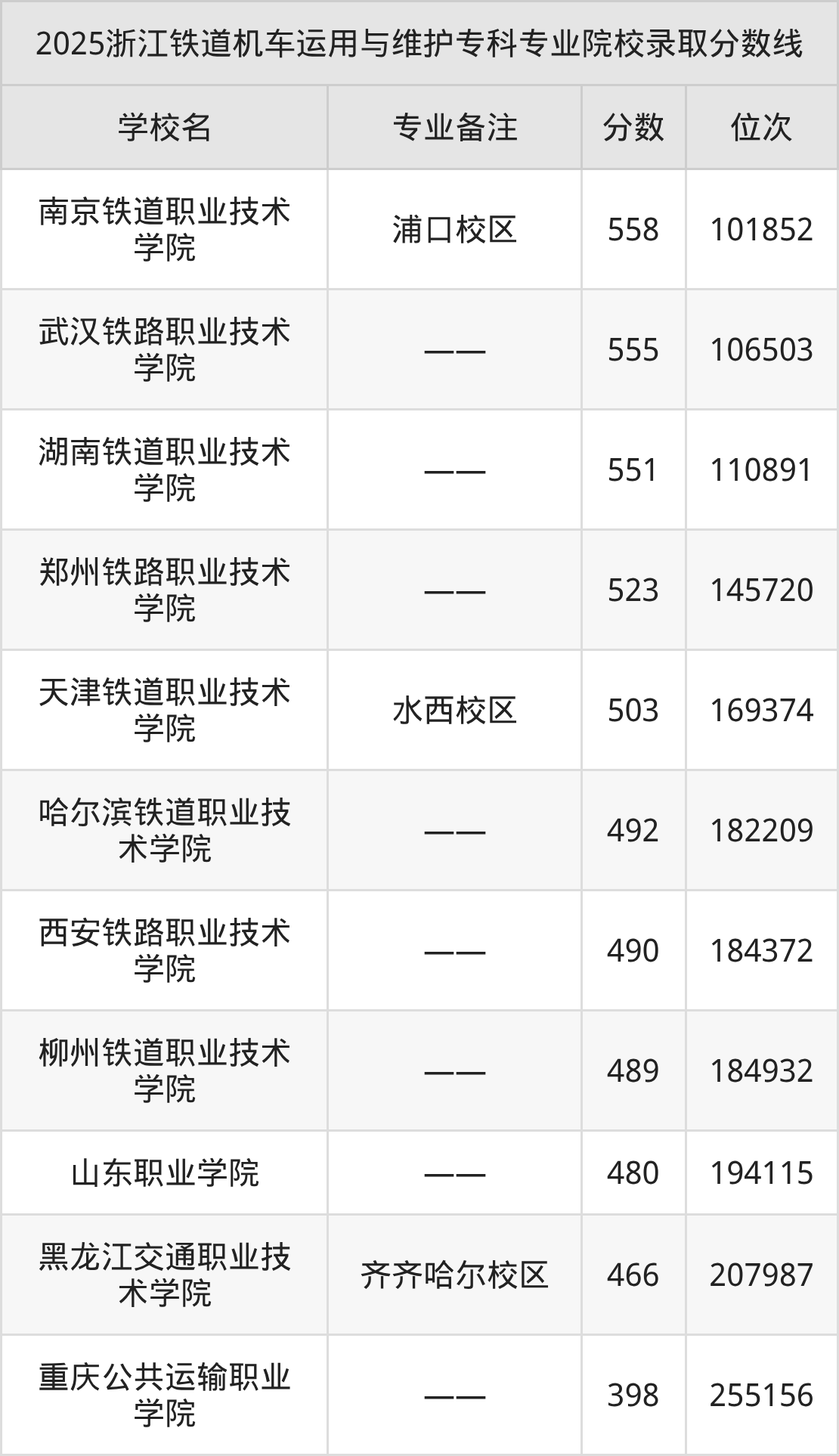 2025年浙江铁道机车运用与维护专科专业招生院校有11所,分数最低的是重庆公共运输职业学院(398分、位次255156名),分数最高的是南京铁道职业技术学院(558分、位次101852名)。
