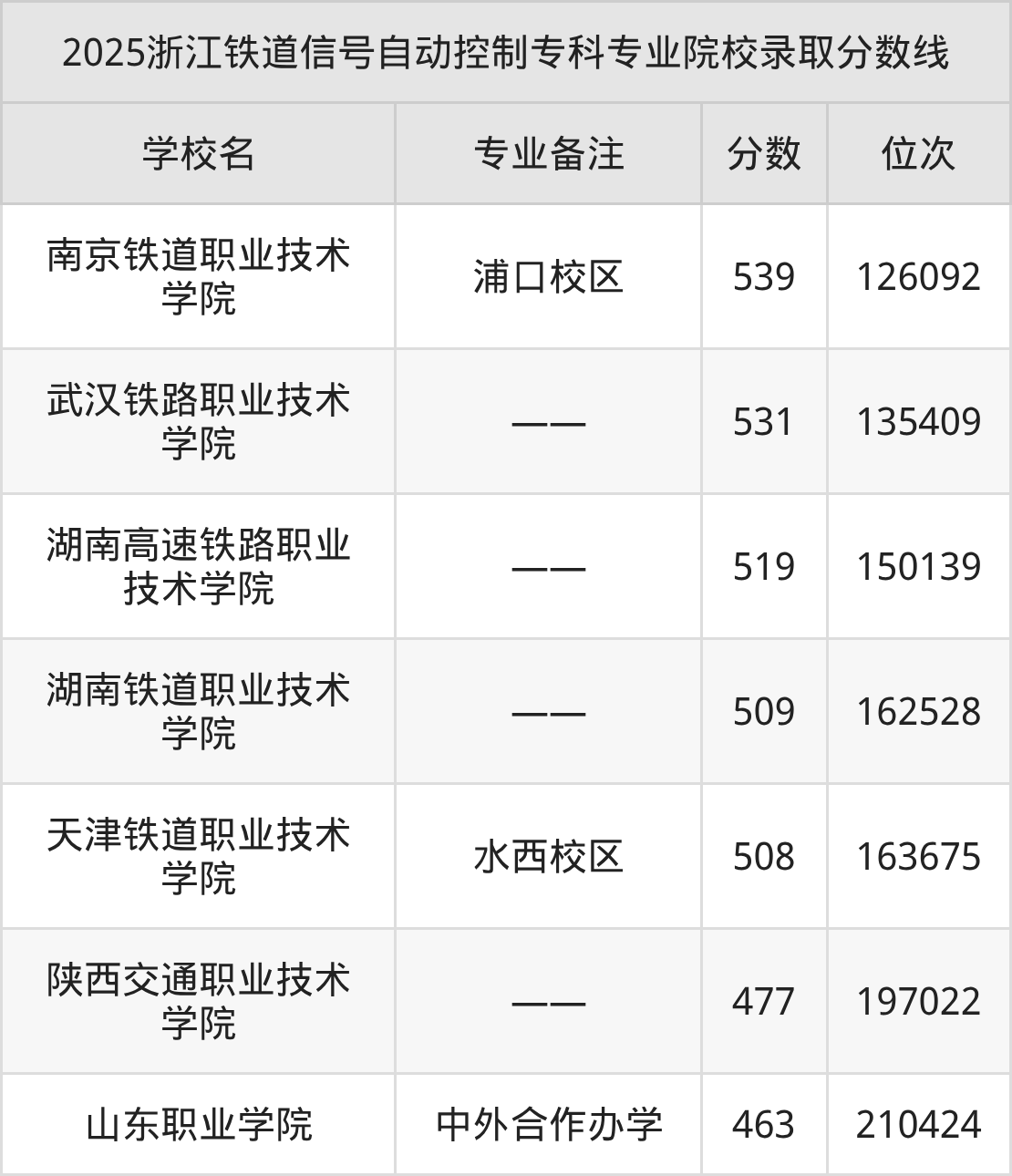 2025年浙江铁道信号自动控制专科专业招生院校有7所,分数最低的是山东职业学院(463分、位次210424名),分数最高的是南京铁道职业技术学院(539分、位次126092名)。