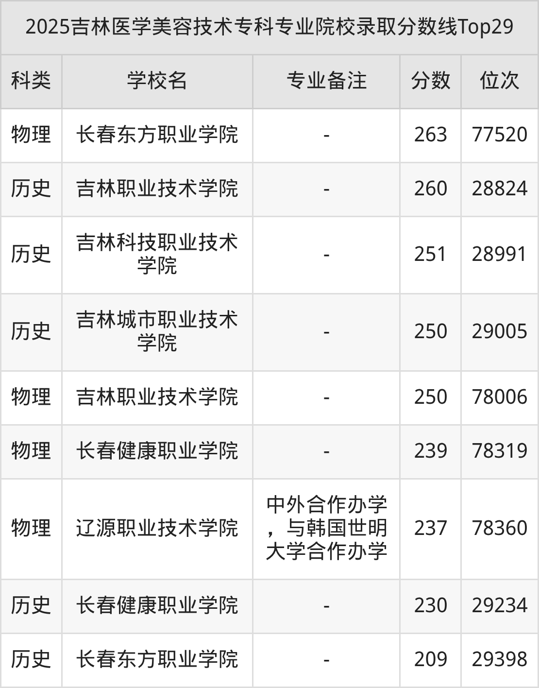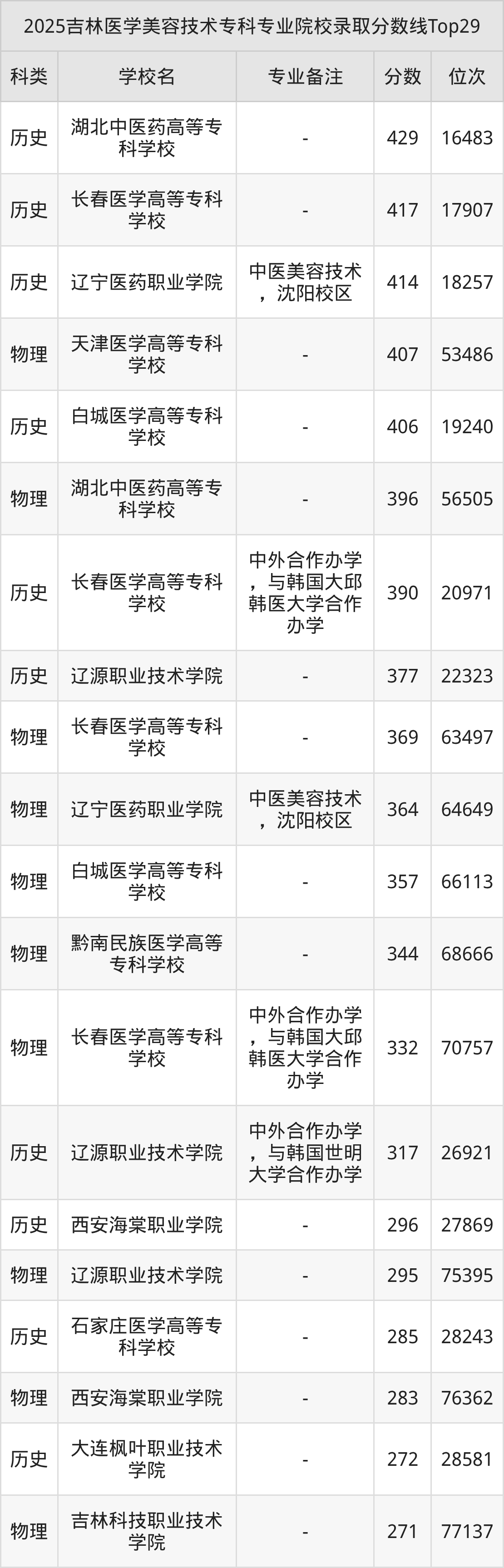 2025年吉林医学美容技术分数线排名前5的大学名单(专科最难报考):