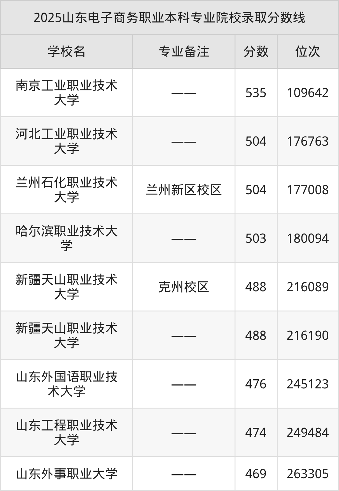 2025年山东电子商务职业本科专业招生院校有8所,分数最低的是山东外事职业大学(469分、位次263305名),分数最高的是南京工业职业技术大学(535分、位次109642名)。