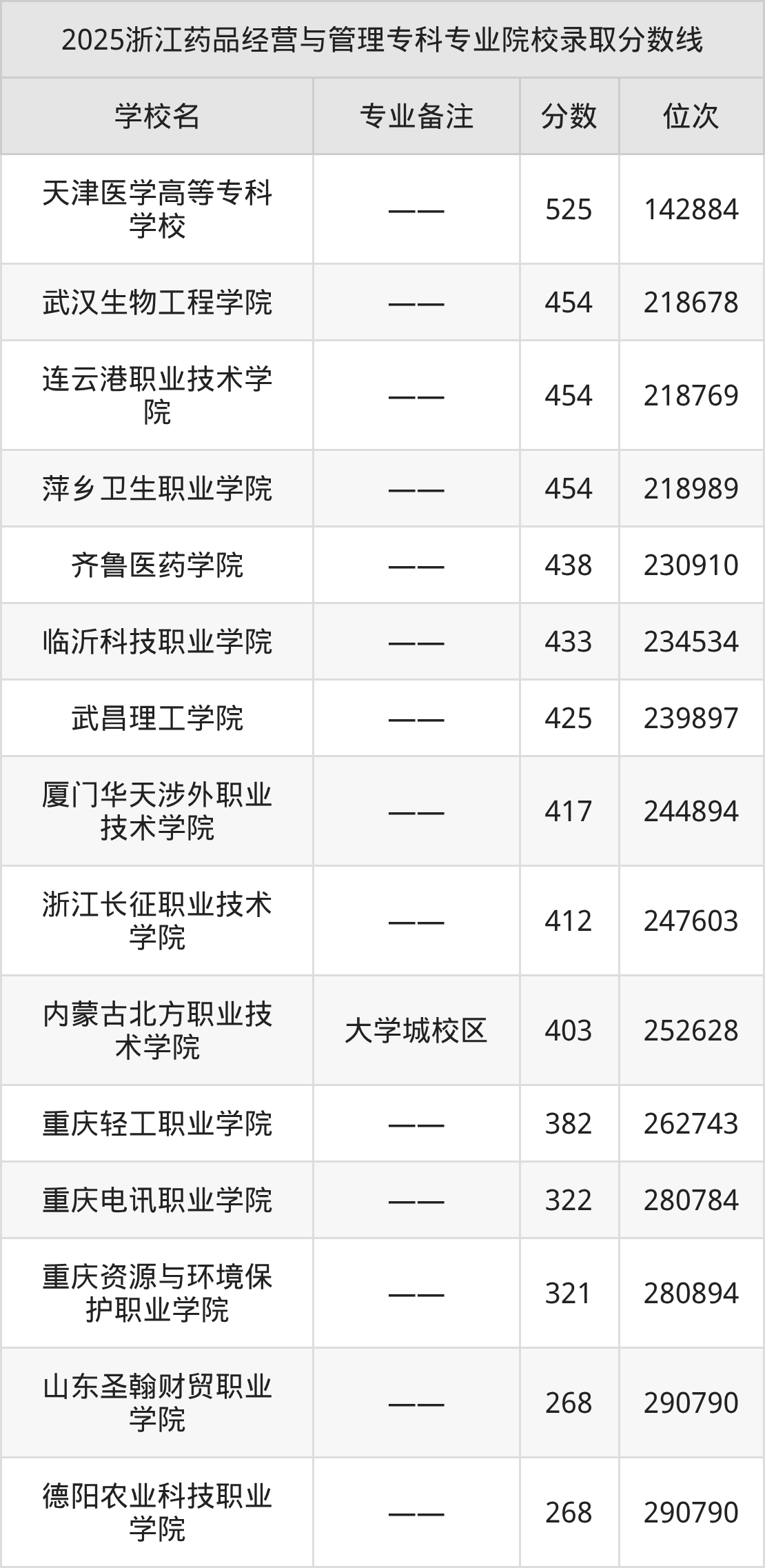 2025年浙江药品经营与管理分数线排名前5的大学名单(专科最难报考):