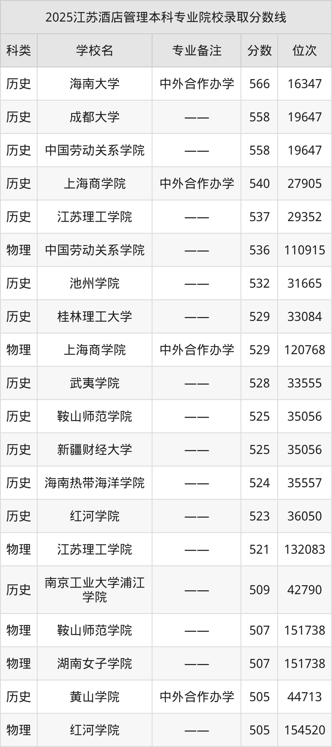 1、海南大学:酒店管理(中外合作办学)566分、历史类位次16347名;