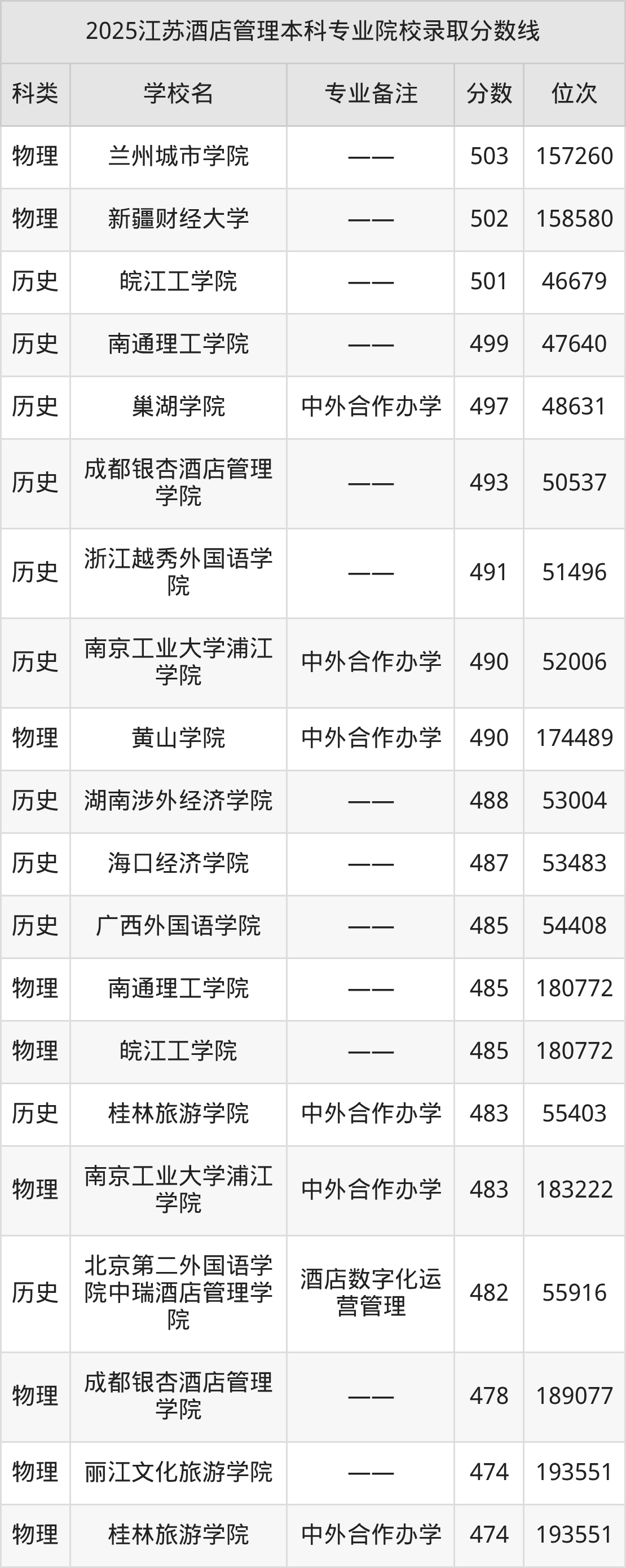 从院校办学性质来看,本科酒店管理公办院校最低分在474分及以上,低分对应院校为桂林旅游学院,2025年超本科线11分录取。民办院校最低分在463分及以上,低分对应院校为北京第二外国语学院中瑞酒店管理学院,2025年本科线下0分录取。