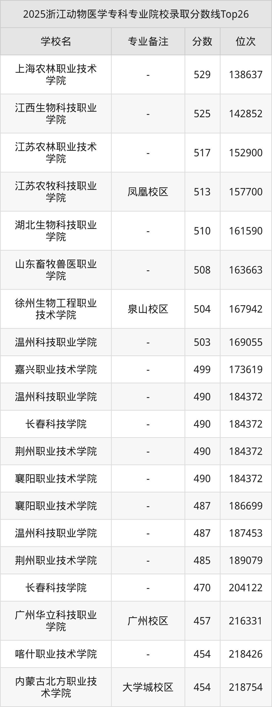 2025年浙江动物医学专科专业招生院校有21所,分数最低的是云南三鑫职业技术学院(268分、位次290790名),分数最高的是上海农林职业技术学院(529分、位次138637名)。
