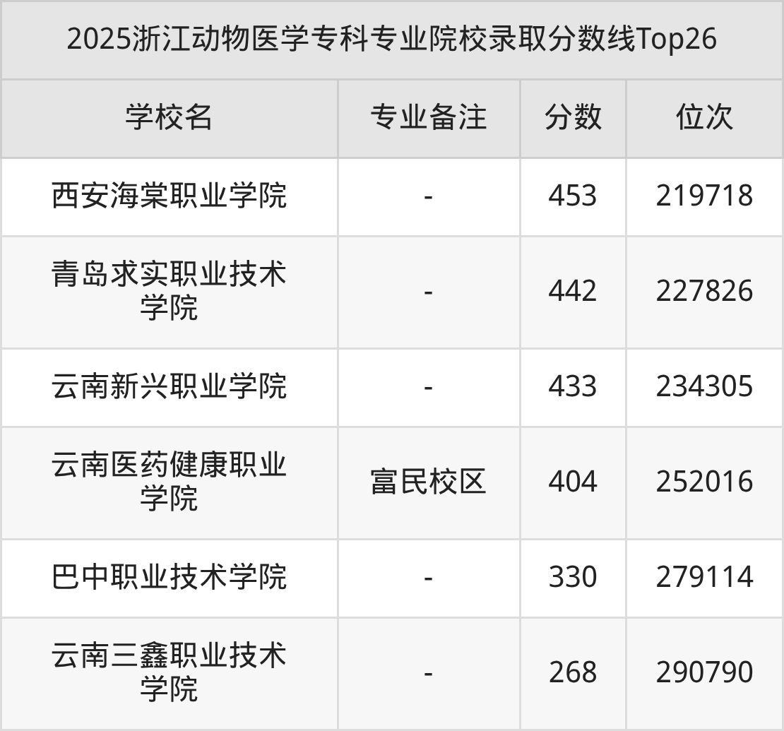 从院校办学性质来看,专科动物医学公办院校最低分在454分及以上,低分对应院校为喀什职业技术学院,2025年超二段线186分录取。民办院校最低分在268分及以上,低分对应院校为云南三鑫职业技术学院,2025年压二段线录取。