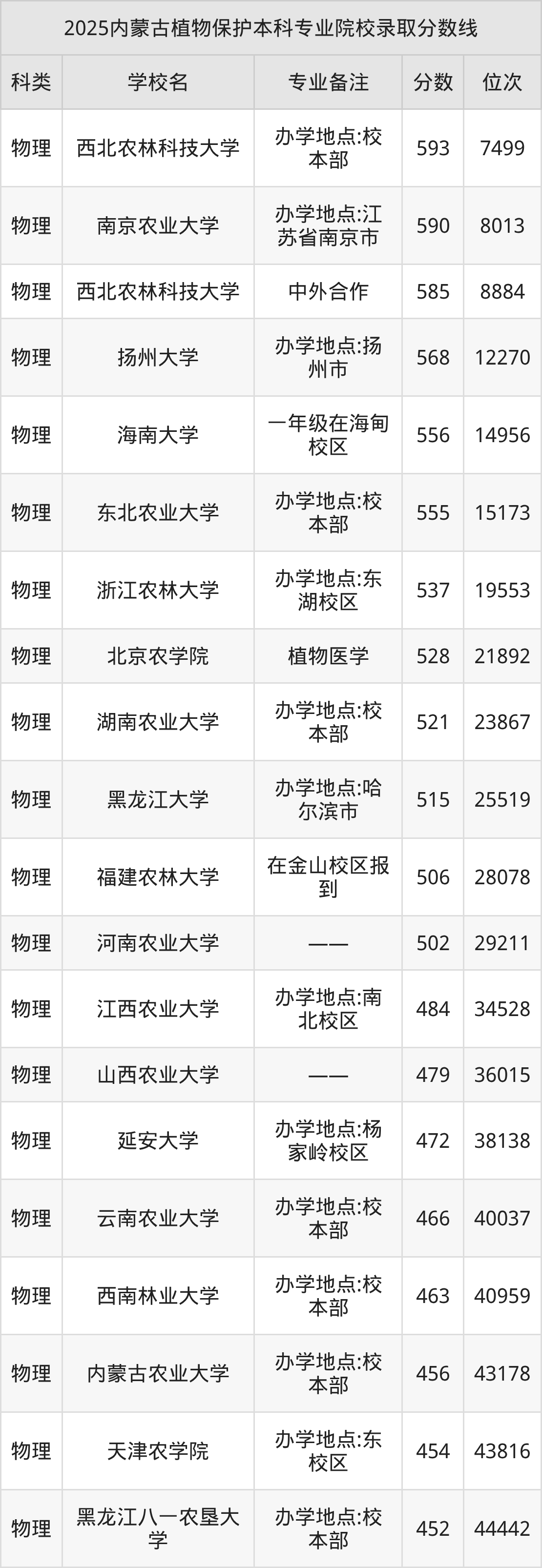 2025年内蒙古植物保护分数线排名前5的大学名单(本科最难报考):