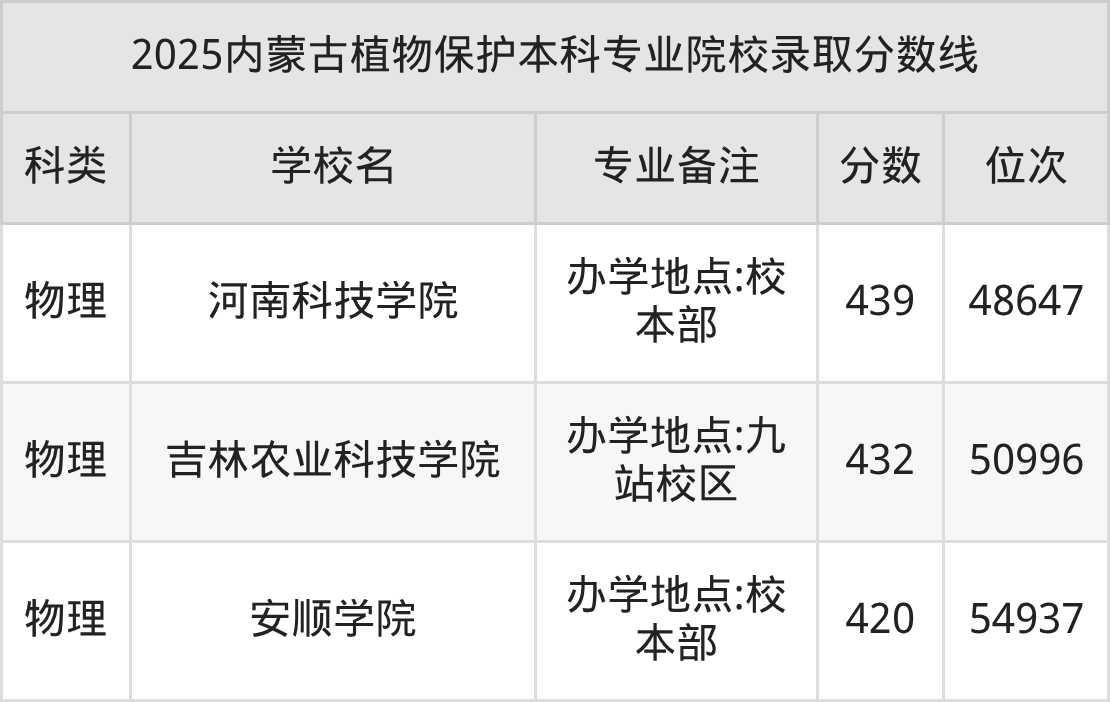 2025植物保护专业在内蒙古录取分数线为:本科420分-593分。结合批次线来看,考生成绩超本科线45分及以上即有机会就读植物保护本科专业,低分录取的本科院校有安顺学院。2026届考生可在下文查阅更多院校名单、分数及排名信息。