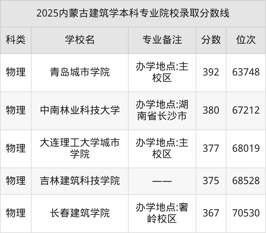 2025年内蒙古建筑学本科专业招生院校有40所,分数最低的是长春建筑学院(367分、物理类位次70530名),分数最高的是武汉大学(603分、物理类位次5890名)。