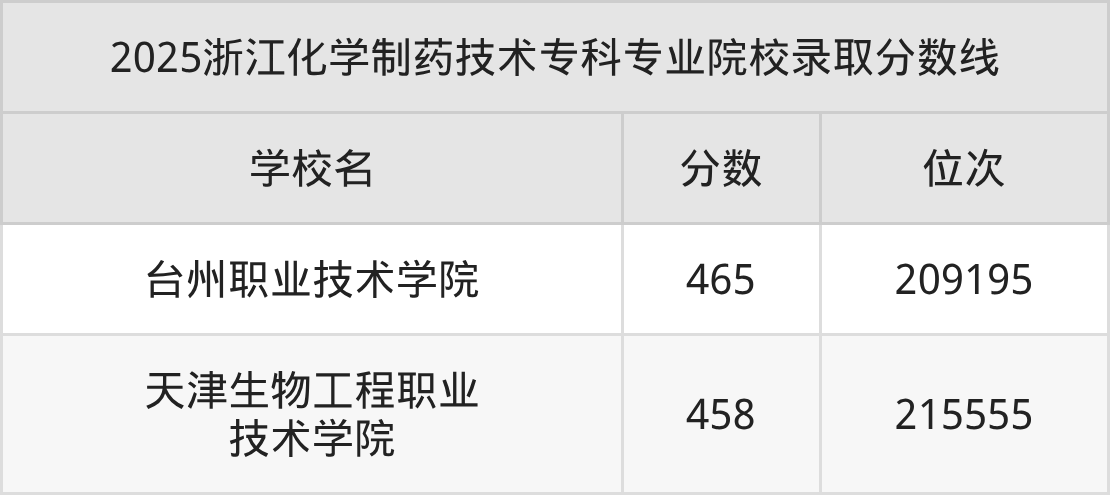 2、台州职业技术学院:化学制药技术465分、位次209195名;