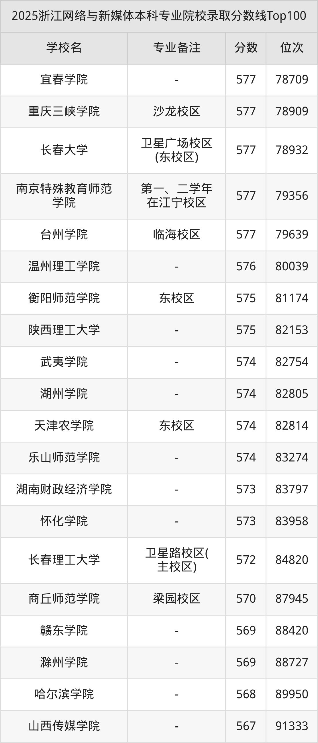 2025浙江省网络与新媒体专业大学综合实力排名表(软科本科排名):