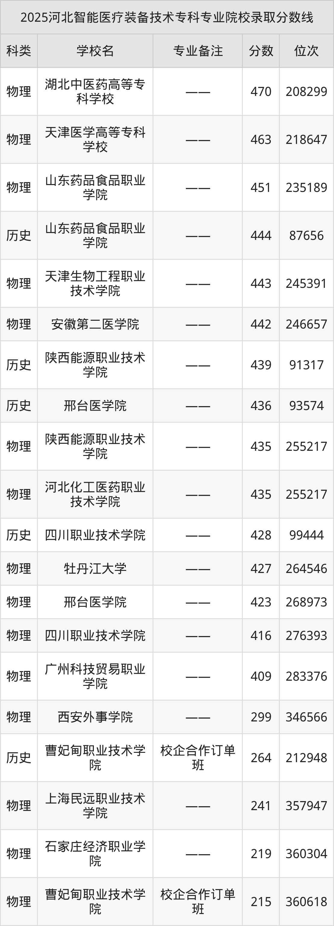 2025年河北智能医疗装备技术分数线排名前5的大学名单(专科最难报考):