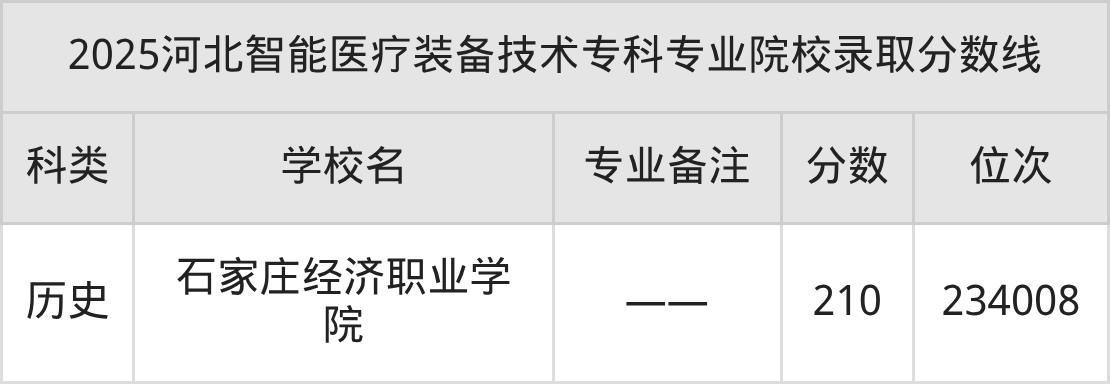 2025智能医疗装备技术专业在河北省录取分数线为:专科210分-470分。结合批次线来看,考生成绩超专科线10分及以上即有机会就读智能医疗装备技术专科专业,低分录取的专科院校有石家庄经济职业学院。2026届考生可在下文查阅更多院校名单、分数及排名信息。