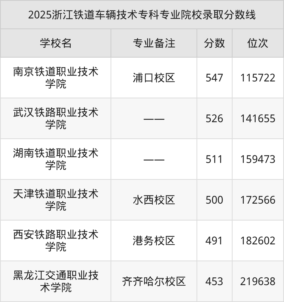 1、南京铁道职业技术学院:铁道车辆技术(浦口校区)547分、位次115722名;