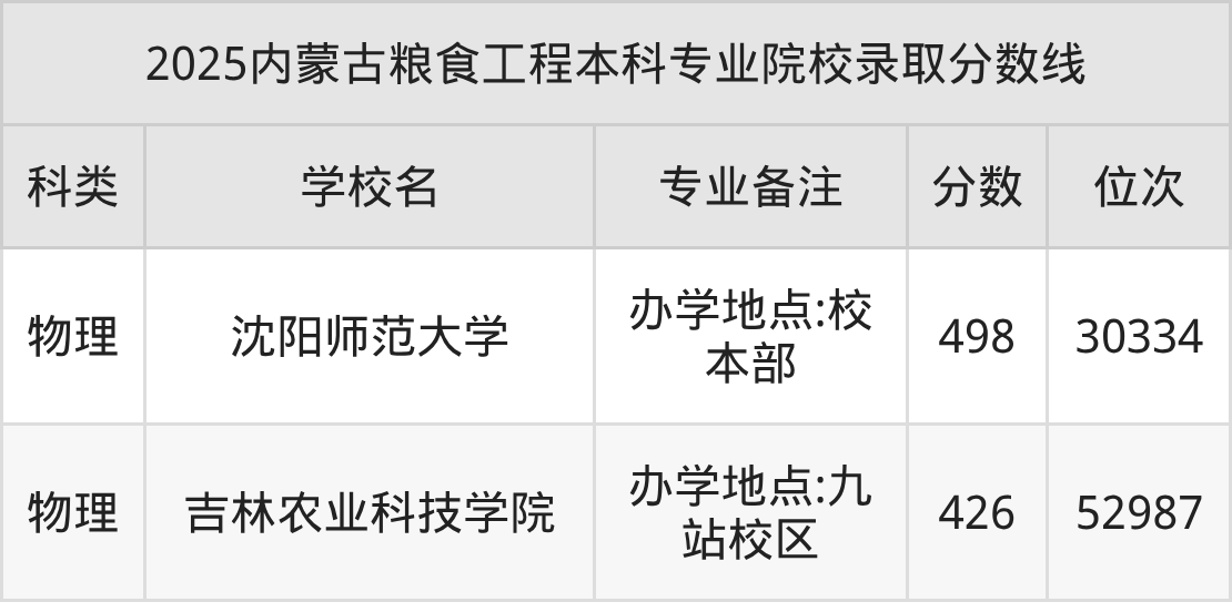 2025年内蒙古粮食工程本科专业招生院校有2所,分数最低的是吉林农业科技学院(426分、物理类位次52987名),分数最高的是沈阳师范大学(498分、物理类位次30334名)。