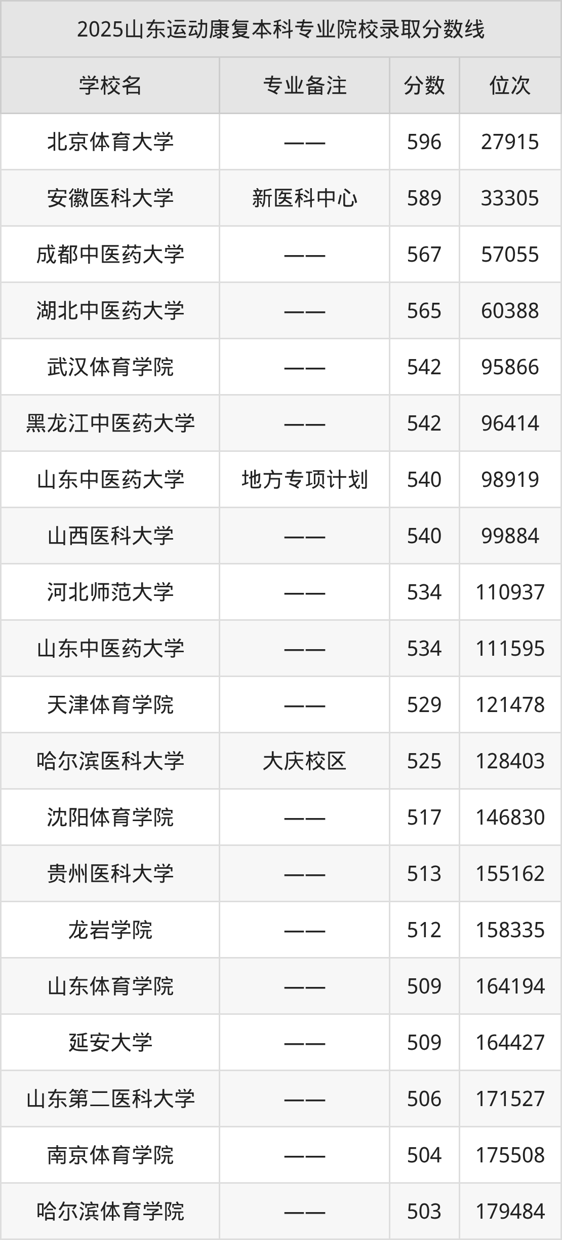2025年山东运动康复本科专业招生院校有21所,分数最低的是锦州医科大学(490分、位次210914名),分数最高的是北京体育大学(596分、位次27915名)。