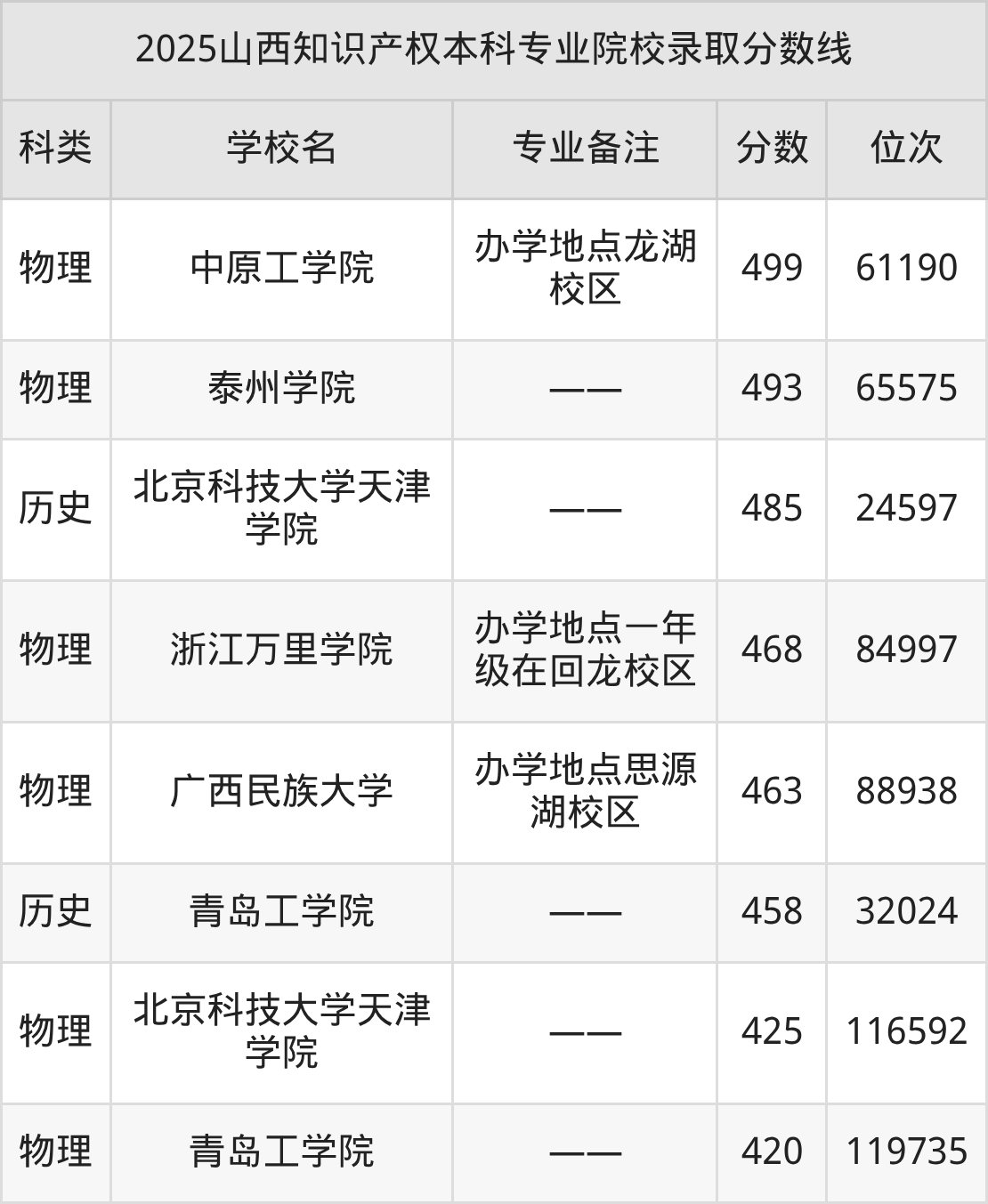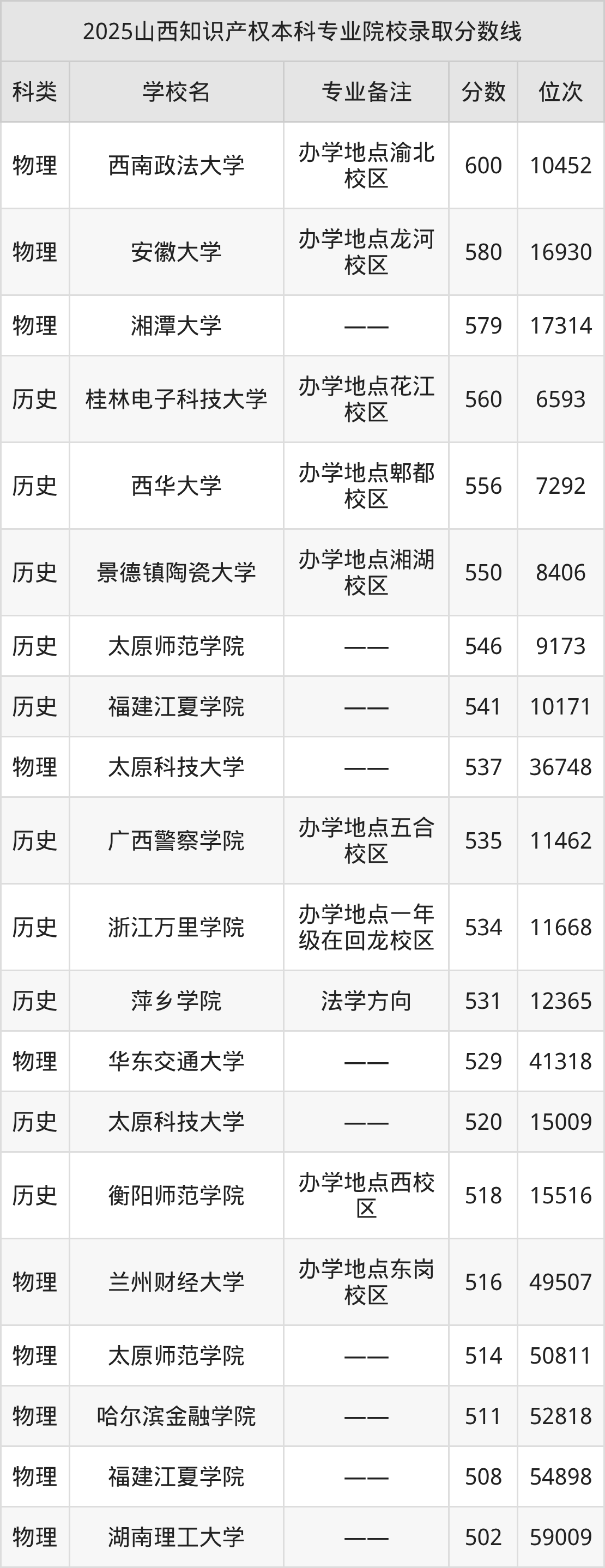 2025年山西知识产权分数线排名前5的大学名单(本科最难报考):