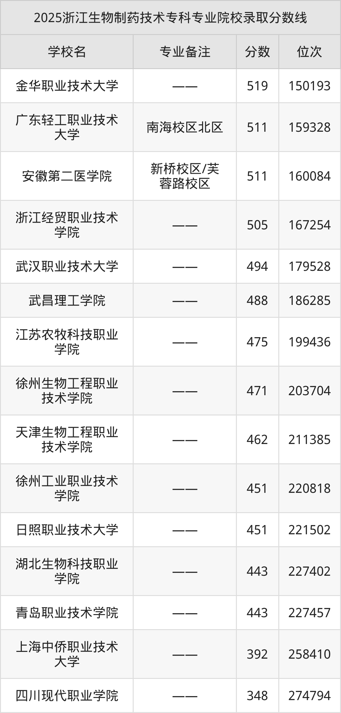 1、专科金华职业技术大学:生物制药技术519分、位次150193名;