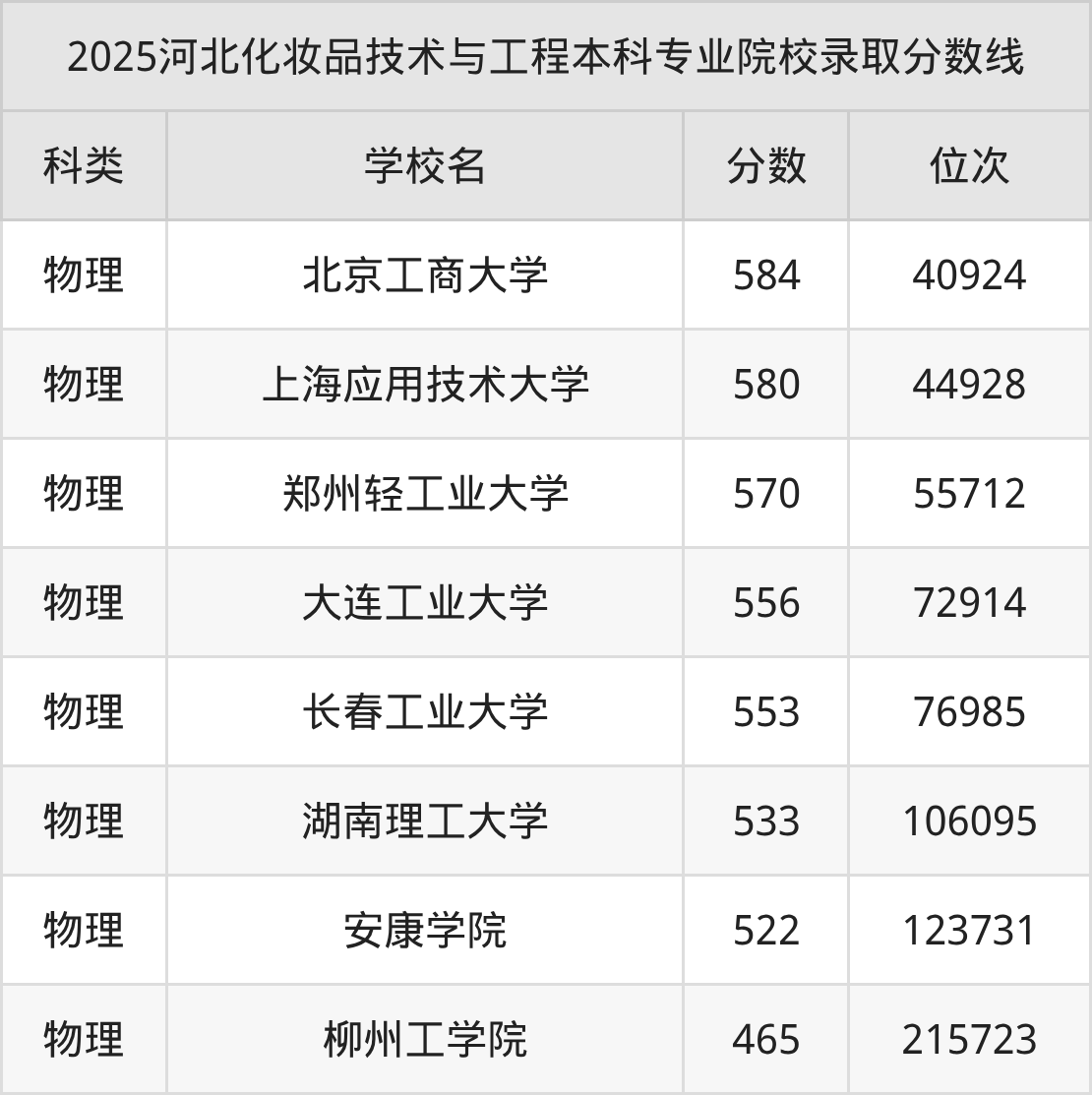 1、北京工商大学:化妆品技术与工程584分、物理类位次40924名;