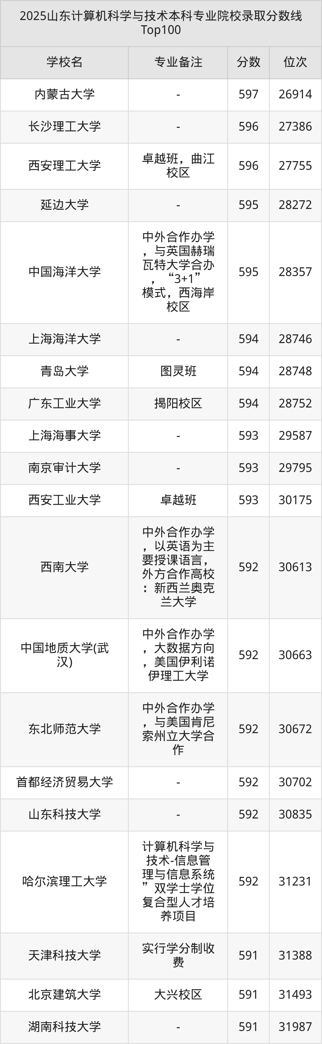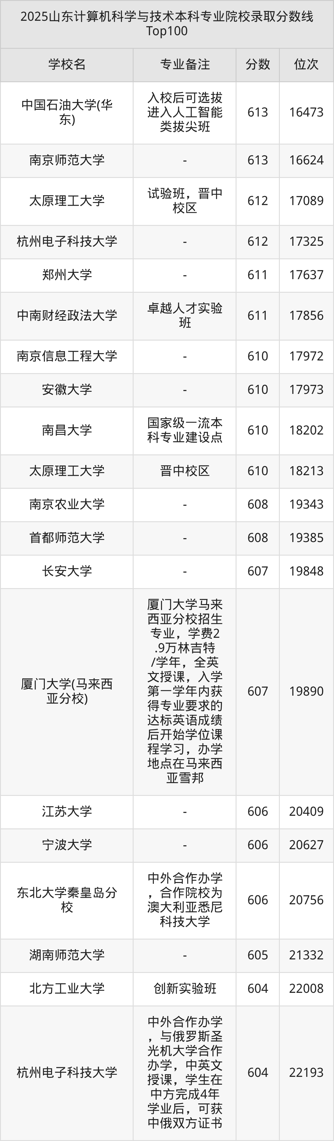 2025计算机科学与技术专业在山东省录取分数线为:本科440分-680分。结合批次线来看,低于一段线1分也有机会就读计算机科学与技术本科专业,低分录取的本科院校有广州华立学院。2026届考生可在下文查阅更多院校名单、分数及排名信息。