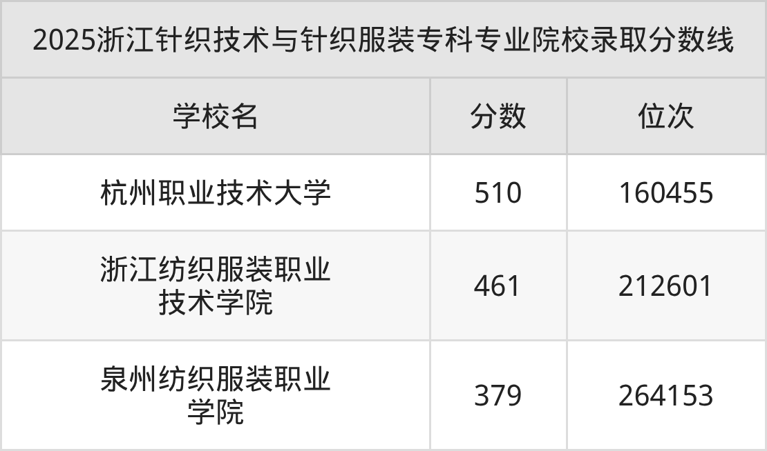 1、杭州职业技术大学:针织技术与针织服装510分、位次160455名;
