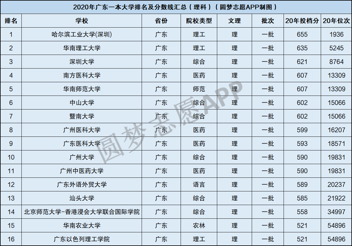 一本大学是民间通俗的说法,实际是指在本科一批次招生的大学,一般各省市教育考试院等官方机构还是说本科一批或本科第一批。所以根据在2020年广东一本大学在湖北理科本科一批中的招生情况来看,目前广东一共有16所一本大学,名单分别为:
