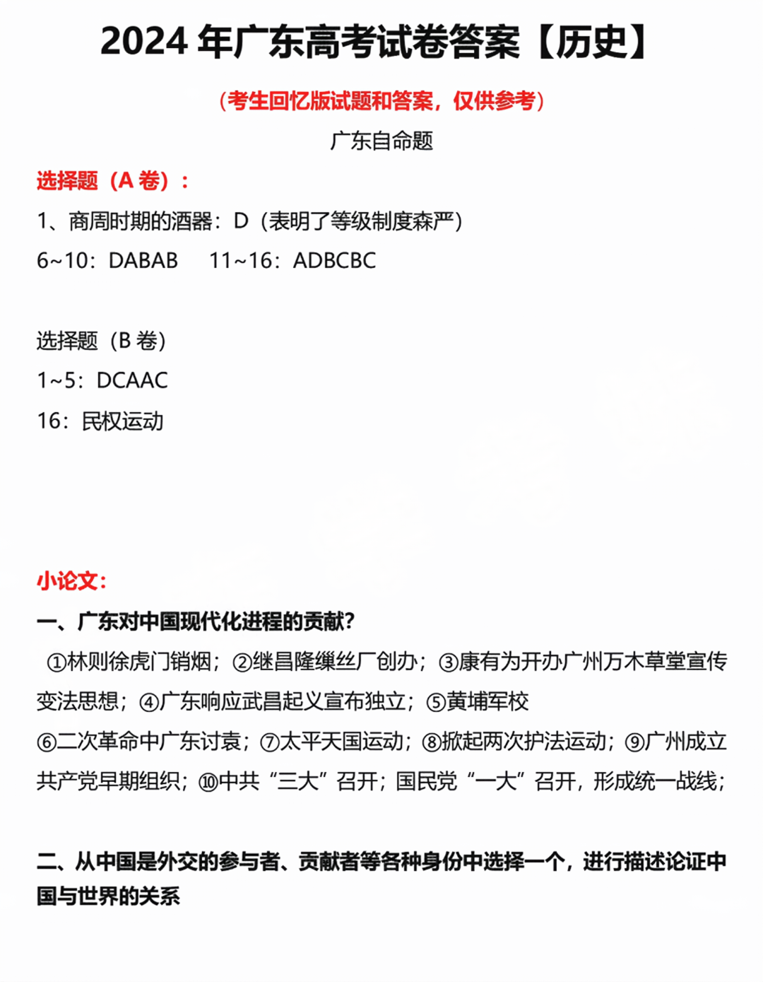 根据目前规定,广东高考历史答案解析考生回忆版已经更新,官方真题及答案正在收集整理中,考生可以收藏关注本文,以便及时了解最新试卷答案情况。关于更多高考答案,可以关注高考100网进行了解。