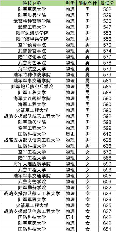 在男生方面,报考难度最大的是国防科技大学,录取线是636分。男生上军校的最低分是502分,对应的院校是陆军军医大学。
