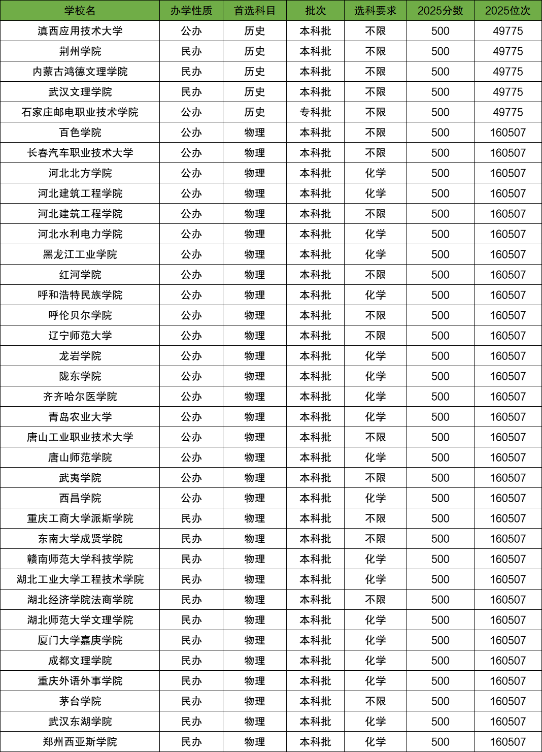 河北省2025年历史类高考500分的大学一共有5所,其中一所为专科院校。河北省在500分的高校我们能够看到并不多。河北省500分的本科大学名单有滇西应用技术大学、荆州学院、内蒙古鸿德文理学院、武汉文理学院,专科院校为石家庄邮电职业技术学院。