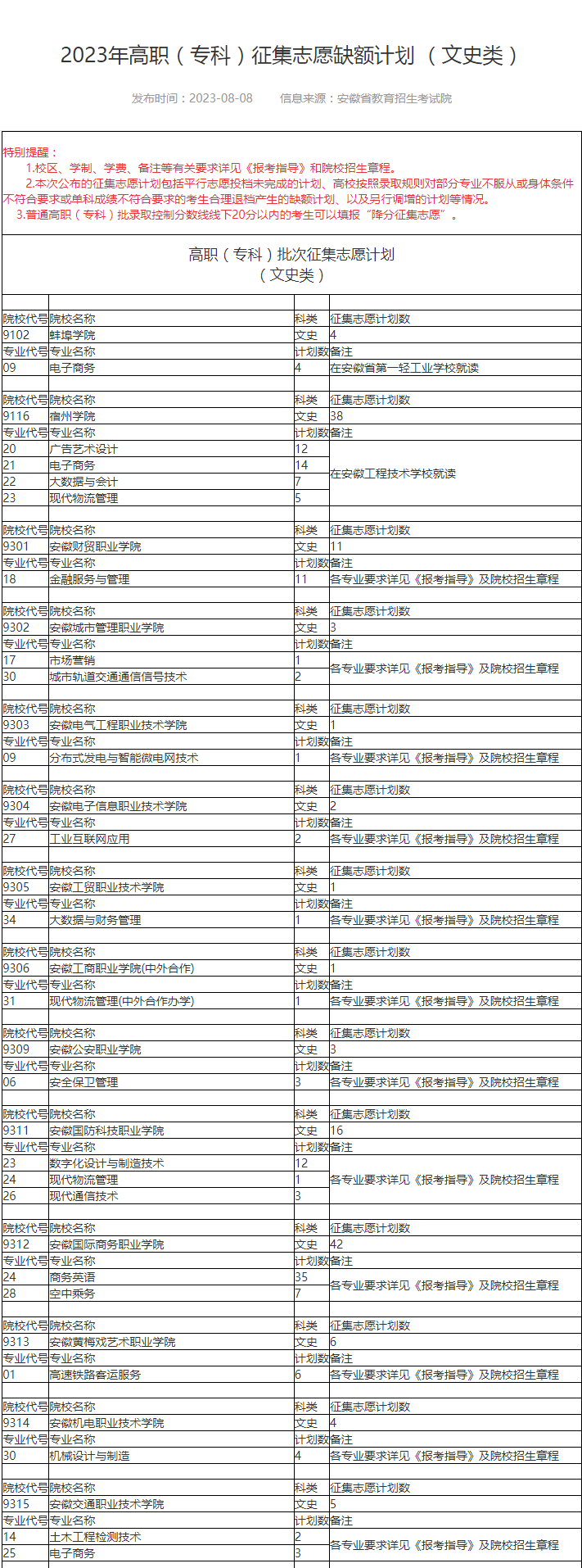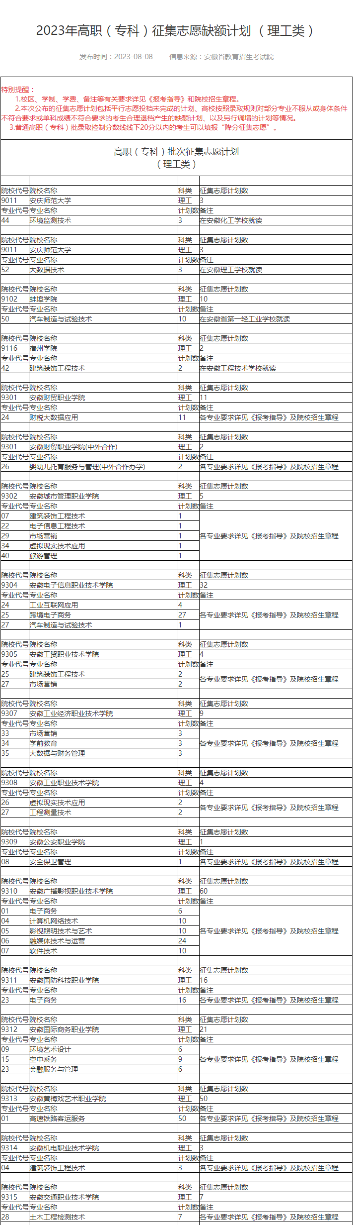 由于篇幅有限,这里就不一一列举,可点击上方链接查看2023年安徽省专科批征集志愿全部院校名单。