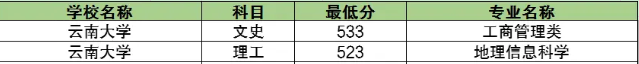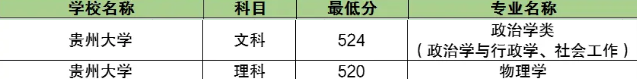 学校高校专项计划文科最低分数线是524分,对应的招生专业是政治学类(政治学与行政学、社会工作);理科最低分数线是520分,对应的招生专业是物理学。