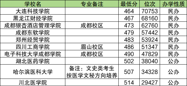 在文科二本招生的信息管理与信息系统大学有10所,录取分数线最低的是大连科技学院(民办),2024年最低分464分;录取分数线最高的是川北医学院,2024年最低分514分。最低分公办二本信息管理与信息系统大学为湖北医药学院,2024年最低分502分。