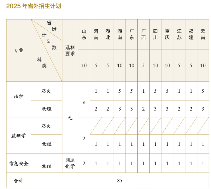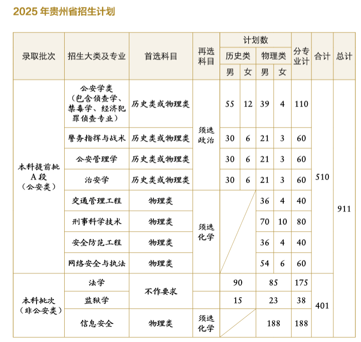 其中在贵州省内的院校只有贵州警察学院,2025年面向贵州省招生计划总数为911人,招生专业包含治安学、侦查学、禁毒学、经济犯罪侦查、公安管理学、警务指挥与战术、刑事科学技术、交通管理工程、安全防范工程、网络安全与执法等。