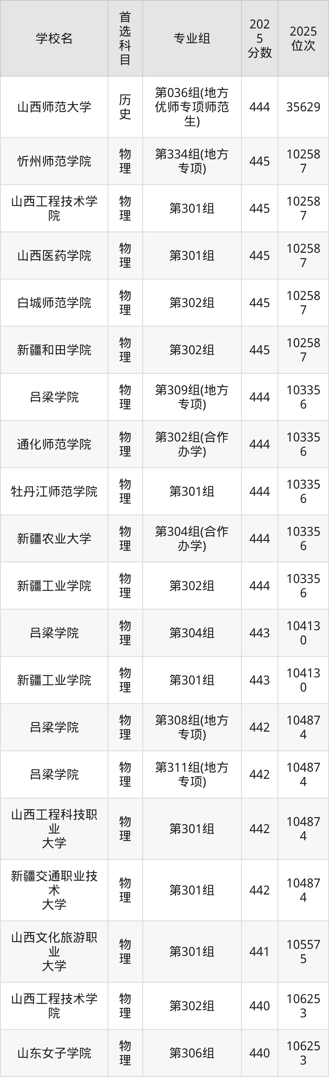 山西440分到445分录取的公办大学一共有17所,历史组考生可选的有山西师范大学第036组(地方优师专项师范生)(444分)1个院校专业组。物理组考生可选的有山西工程技术学院第302组(440分)、山东女子学院第306组(440分)、玉林师范学院第301组(440分)、乌鲁木齐职业大学第301组(440分)等21个院校专业组。