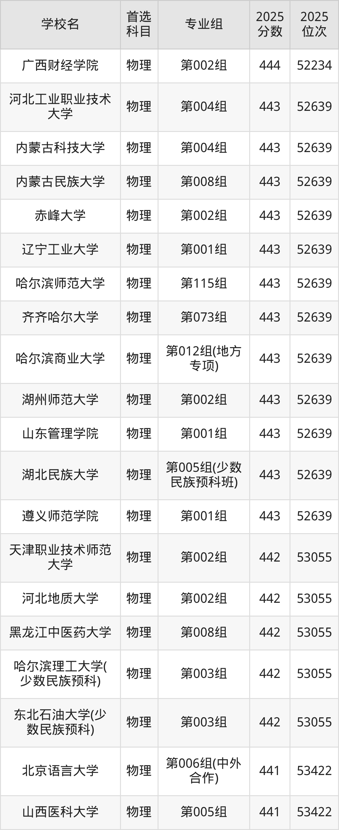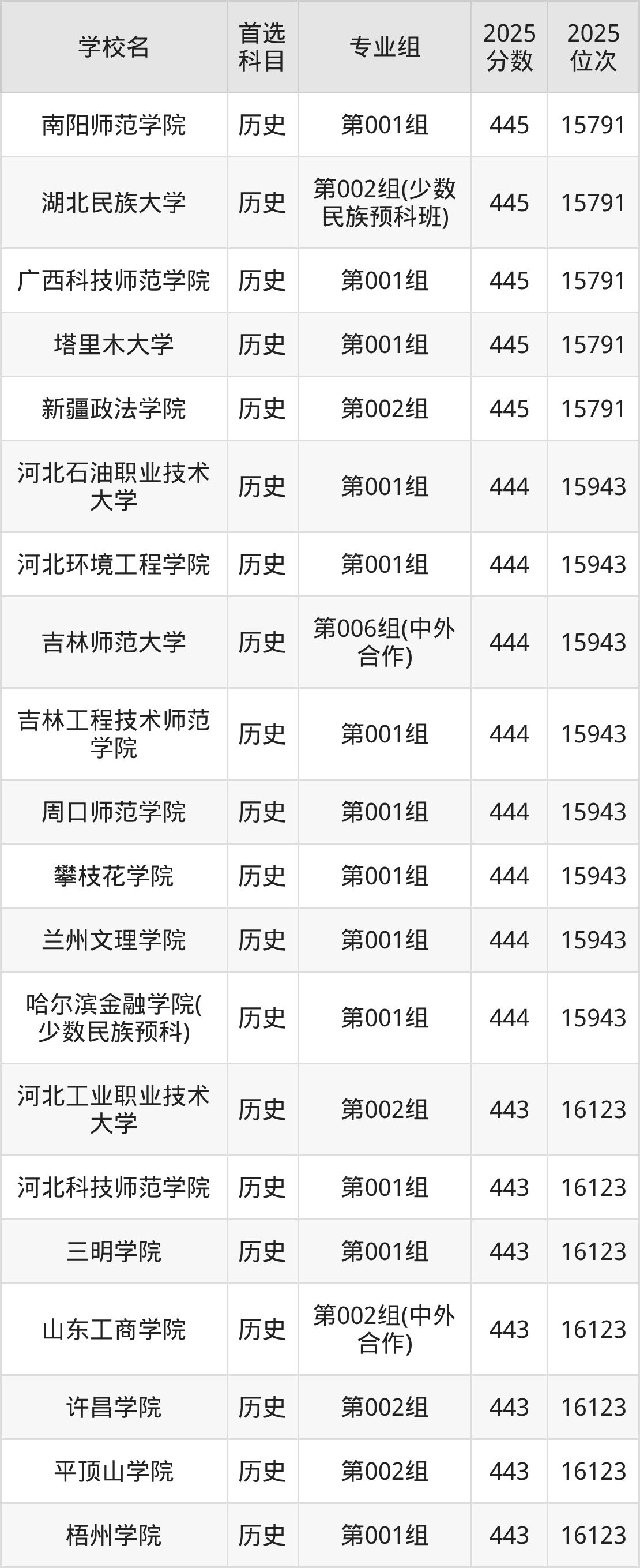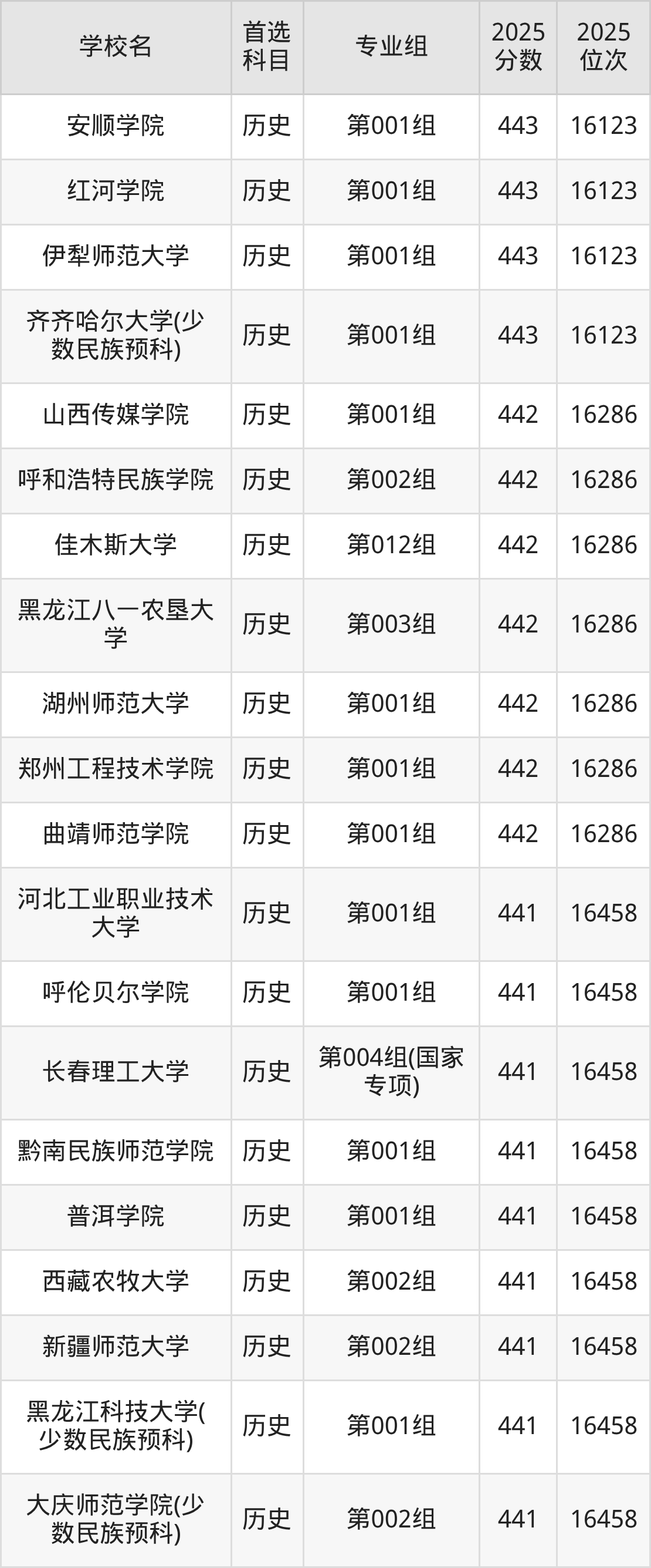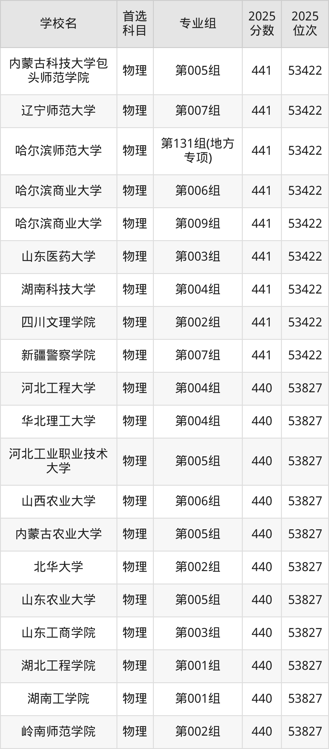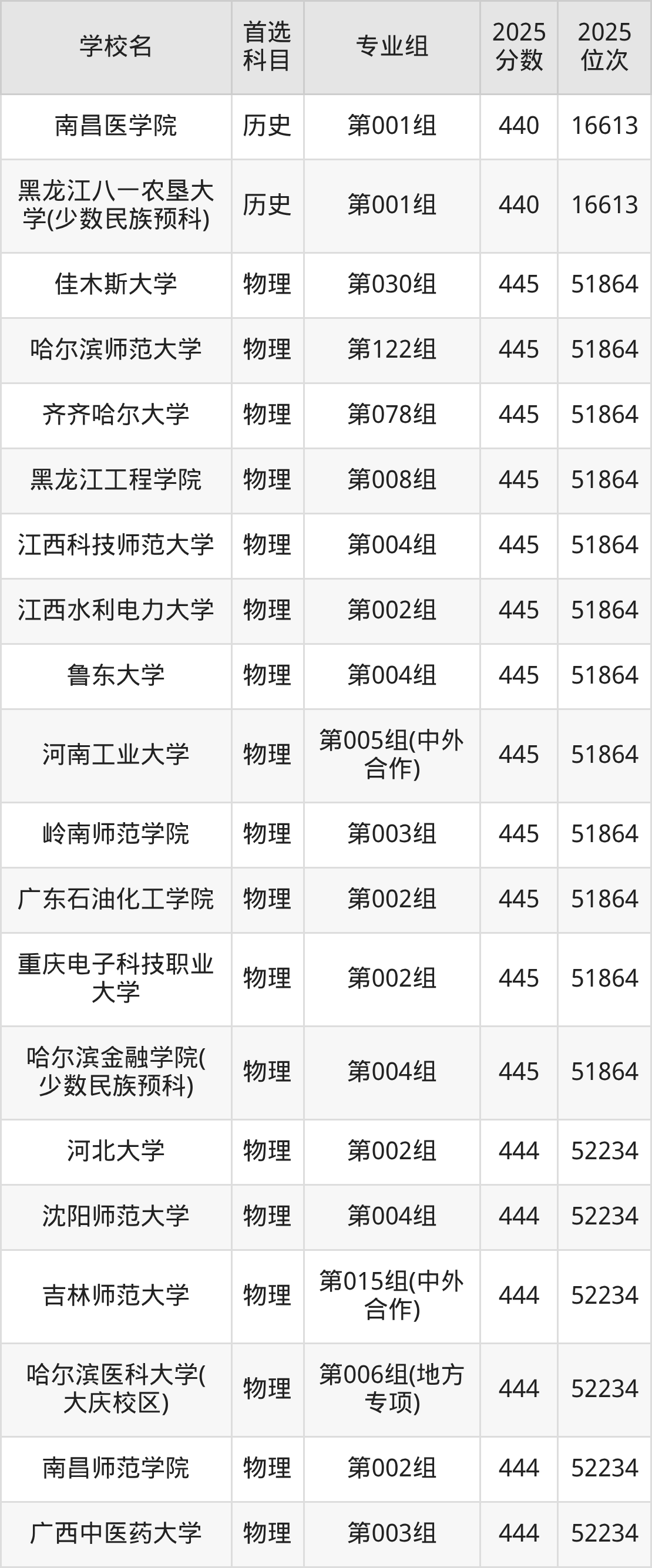 历史组考生可以选择的有51个院校专业组,分数较低的是南昌医学院第001组,2025年最低分440分,位次16613名。物理组考生可以选择的有58个院校专业组,省内的有哈尔滨师范大学第131组(地方专项)(441分)、哈尔滨商业大学第006组(441分)等。