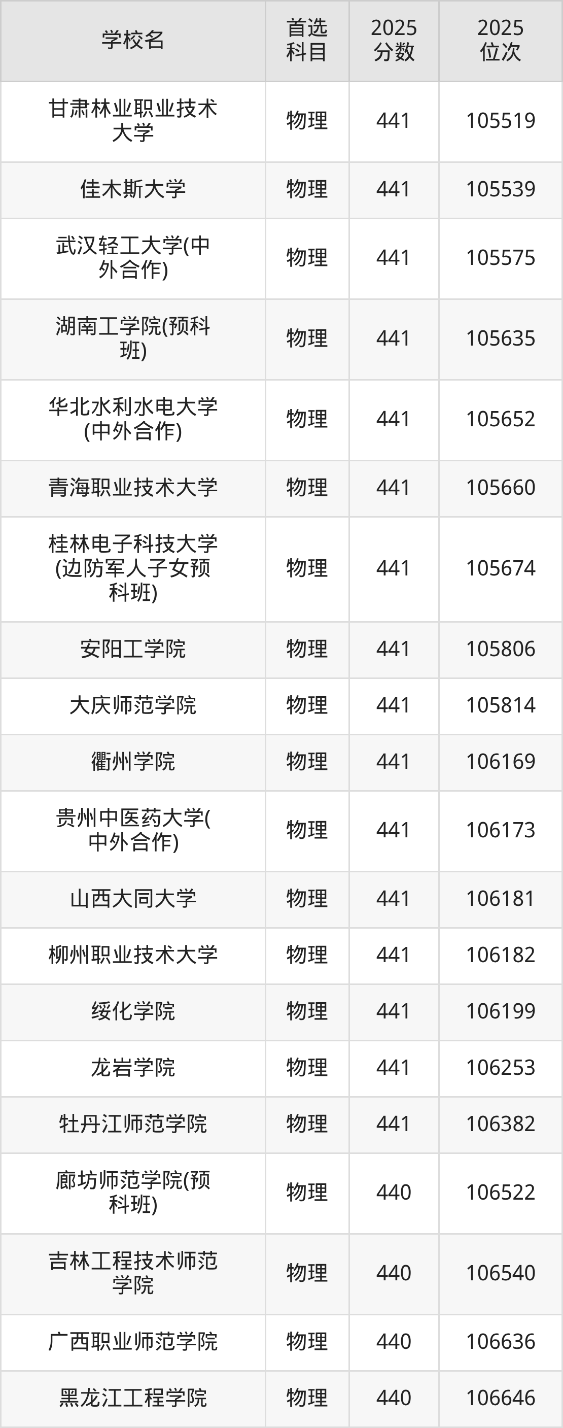 2025年录取分数线显示:高考440分左右能上的公办二本大学有南昌医学院、黑龙江八一农垦大学(少数民族预科)、河北工程大学、华北理工大学、河北工业职业技术大学、山西农业大学、内蒙古农业大学、北华大学等,各省名单不同,具体如下文所示。