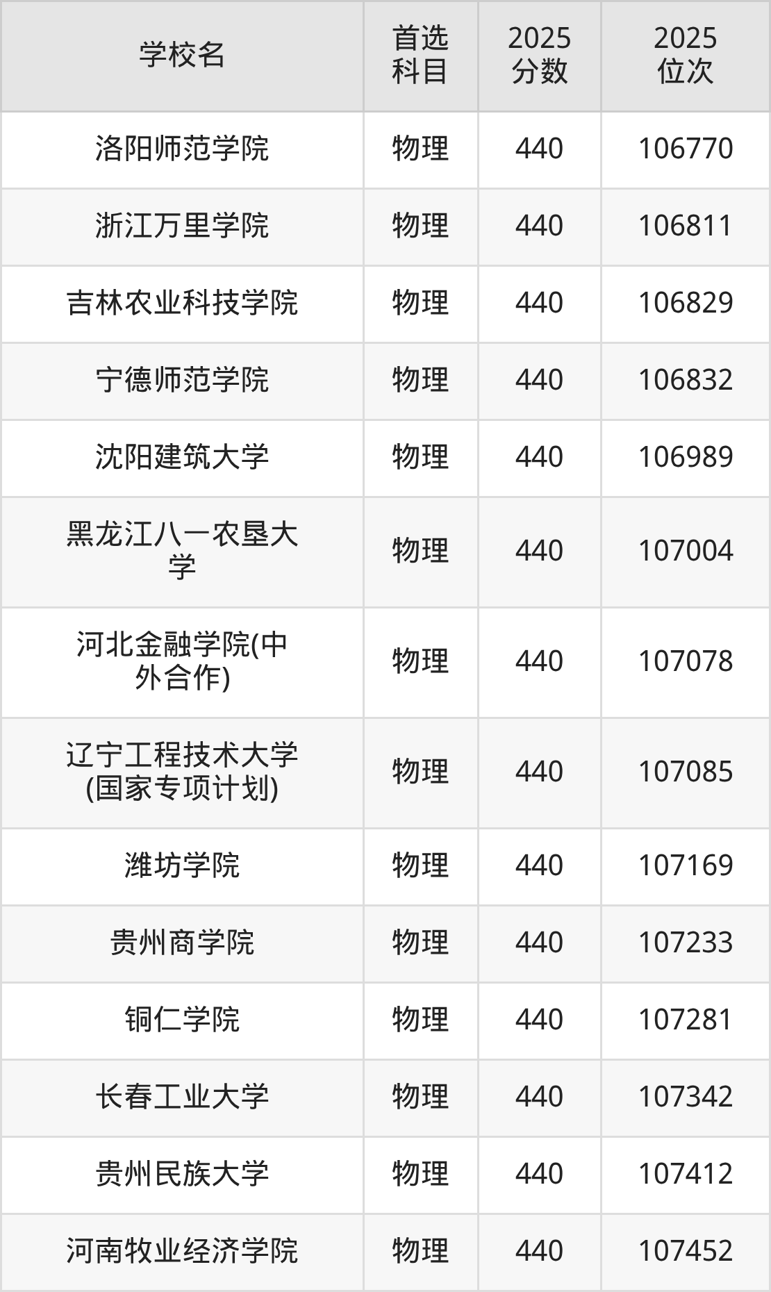 2025年贵州录取分数线440分到445分之间的公办二本院校一共有94个,全部为物理类招生。可以报考的二本院校如下: