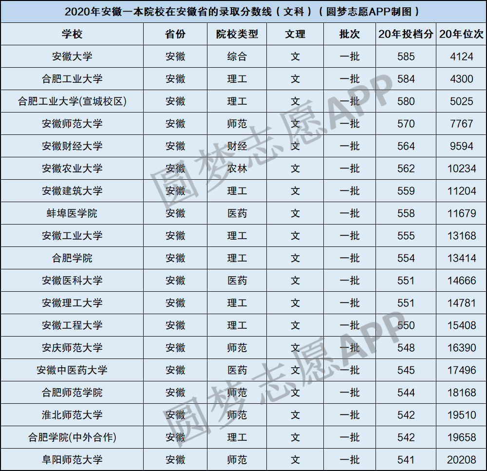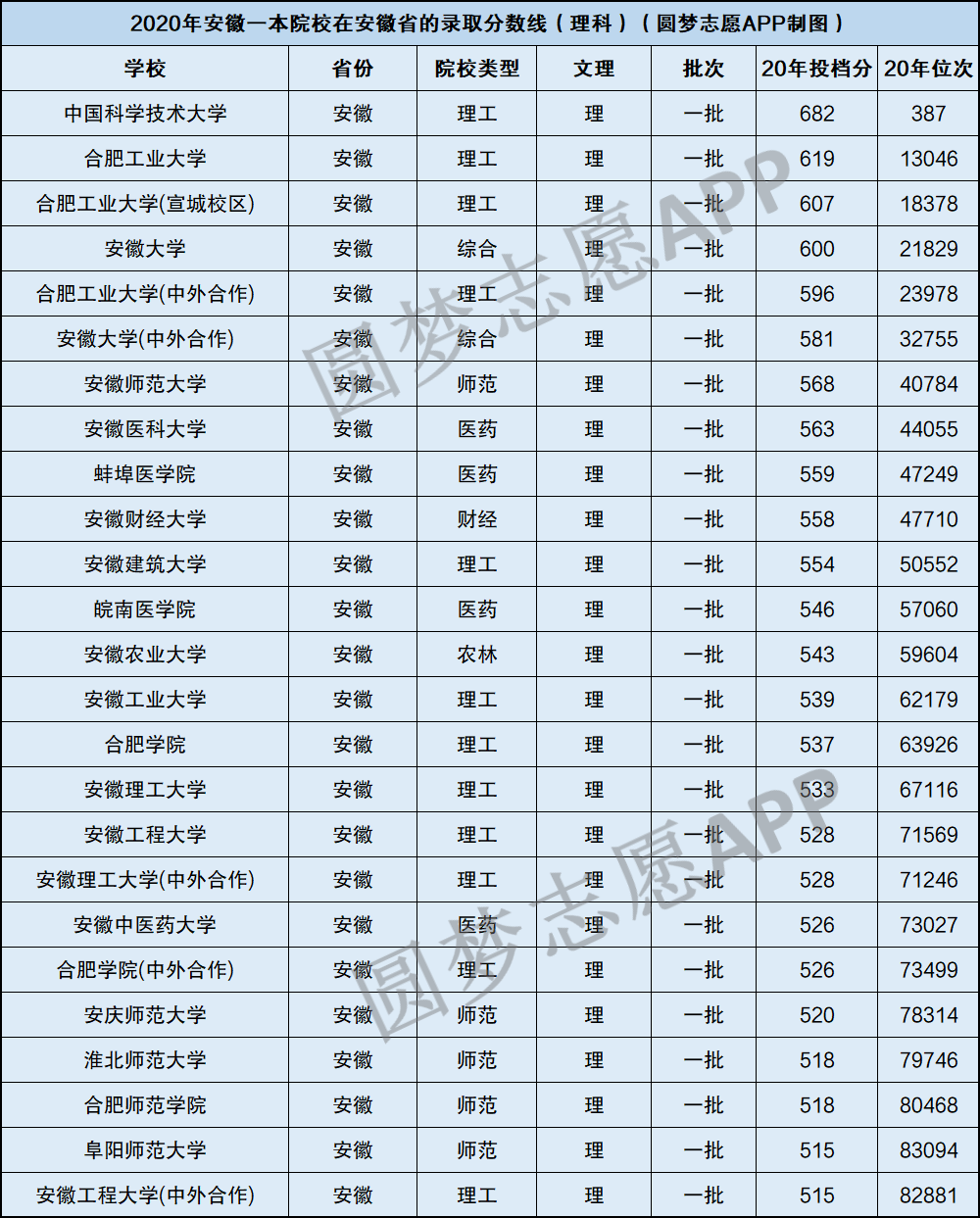 根据2020年安徽省教育考试院公布的招录数据,小编为大家整理出了2020年安徽一本院校在安徽省的录取分数线,具体如下: