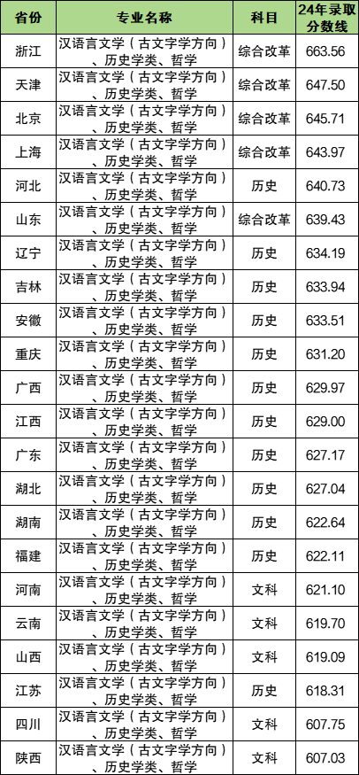 录取分数最高的省份为浙江,2024年分数为663.56分,招生专业有汉语言文学、历史学类、哲学;而录取分最低的省份是山西,2024年分数为607.03分。